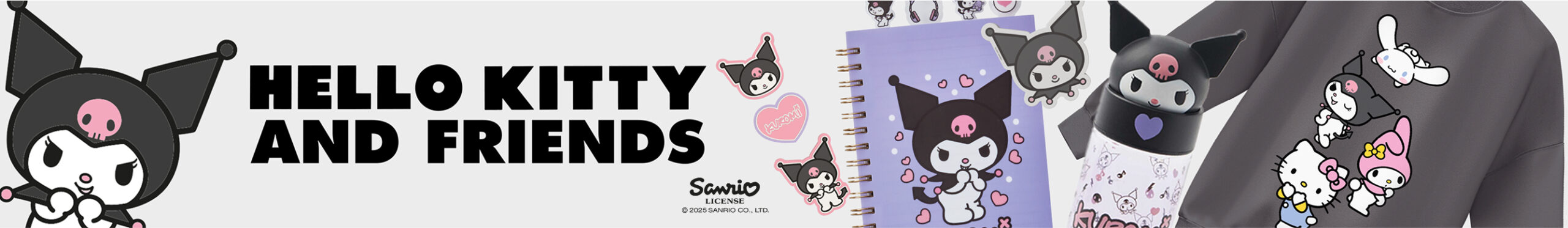 Arriva una collezione imperdibile con tutta la grinta della mitica Kuromi! Trovi cancelleria e articoli scolastici come quaderni, libri per esercitarsi, evidenziatori, post-it, astucci e – naturalmente – borracce e contenitori portapranzo nel suo inconfondibile colore viola. In negozio ti aspettano anche capi per ragazze con altri amatissimi personaggi come Hello Kitty e Cinnamonroll!