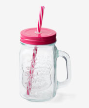 Questo barattolo con coperchio e cannuccia rosa è ottimo per servire limonata, frullati o acqua. Il coperchio protegge il contenuto da sporco e insetti, mentre la cannuccia colorata rende ancora più piacevole sorseggiare la vostra bevanda preferita! Scopri anche l’altra colorazione disponibile nella stessa collezione!