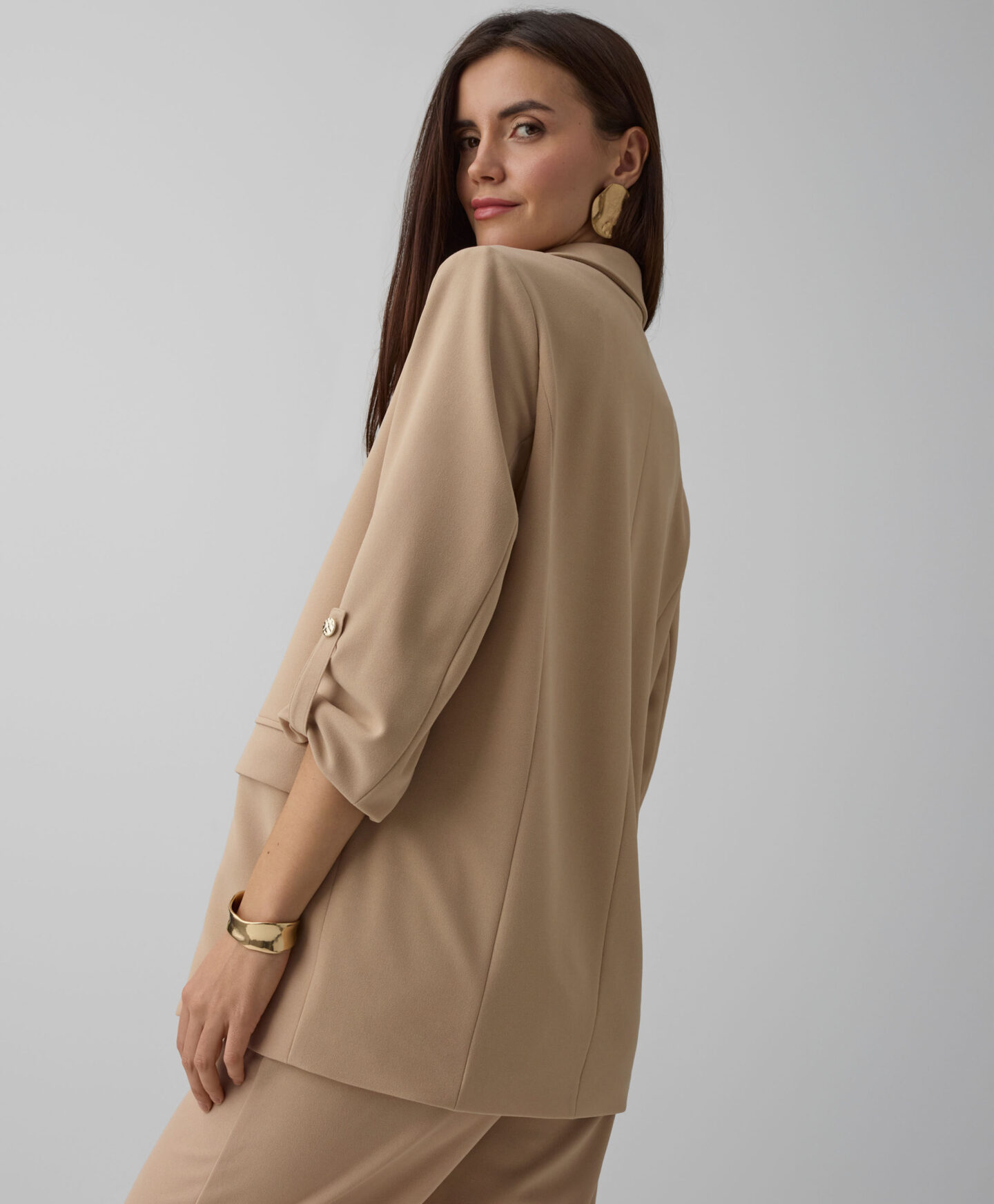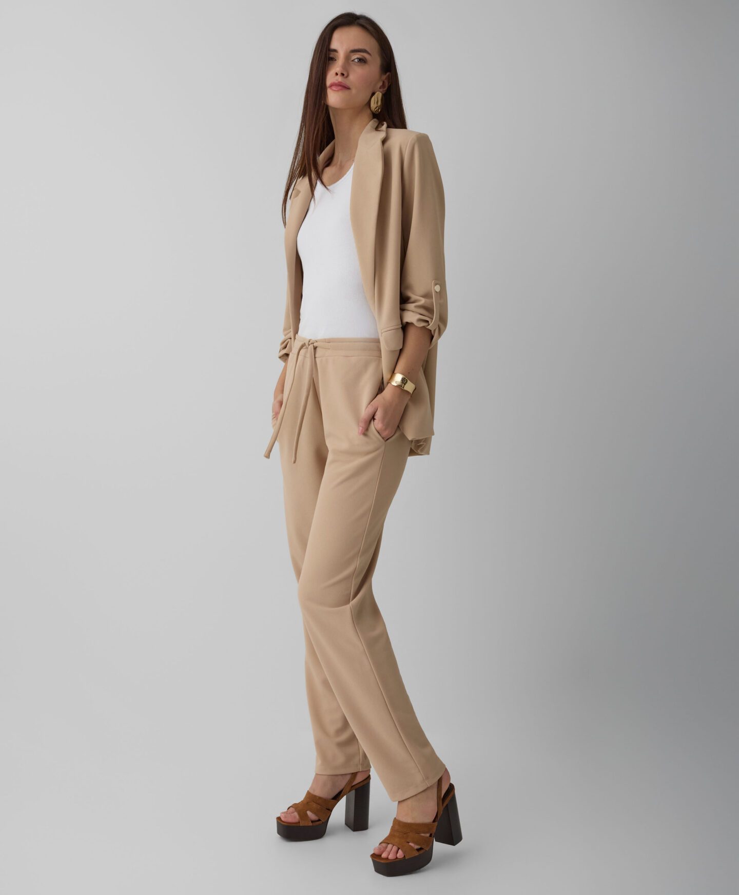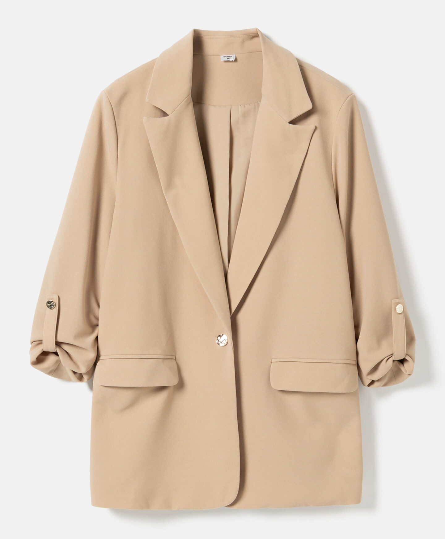 Scopri questo blazer beige da donna, un capo jolly nel tuo armadio! Leggero e versatile, si abbina perfettamente ai pantaloni beige della stessa collezione ma anche a un abito elegante o a una semplice t-shirt. Ideale per l’ufficio, una riunione importante o una cena in famiglia, regala subito un tocco di classe senza rinunciare alla comodità. Il colore neutro si adatta a ogni occasione, lasciandoti libera di esprimere il tuo stile con un capo intramontabile.