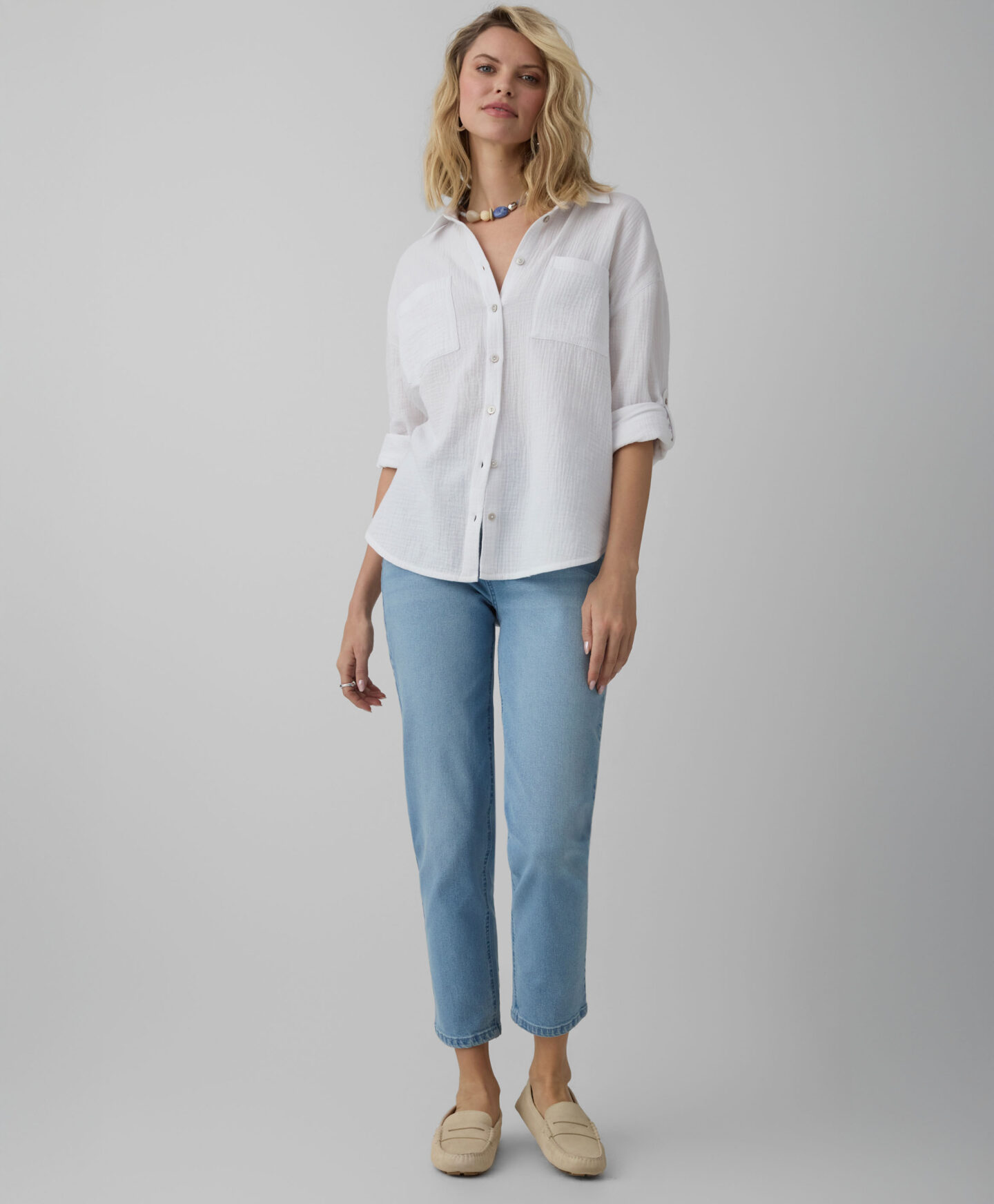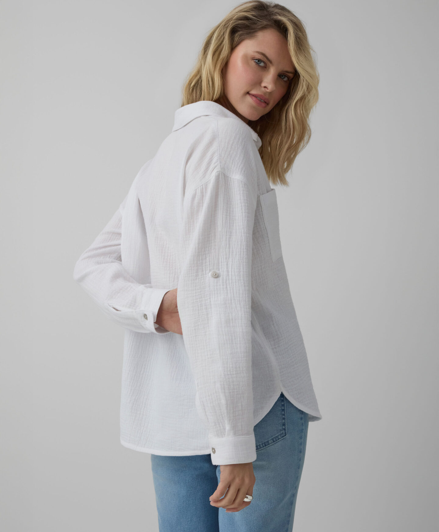 Scopri il comfort di questa camicia bianca da donna in puro cotone! Morbida come una carezza e leggera come una piuma, lascia respirare la pelle in ogni stagione. Il colore universale si abbina a tutto: jeans per un look casual, gonna per un tocco elegante o pantaloni da ufficio per uno stile impeccabile. Questa camicia è un capo essenziale che non può mancare nel tuo armadio.