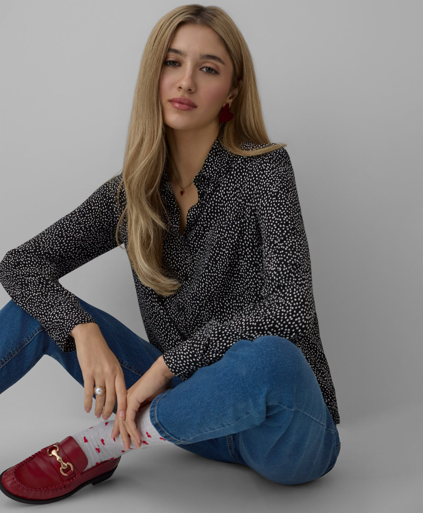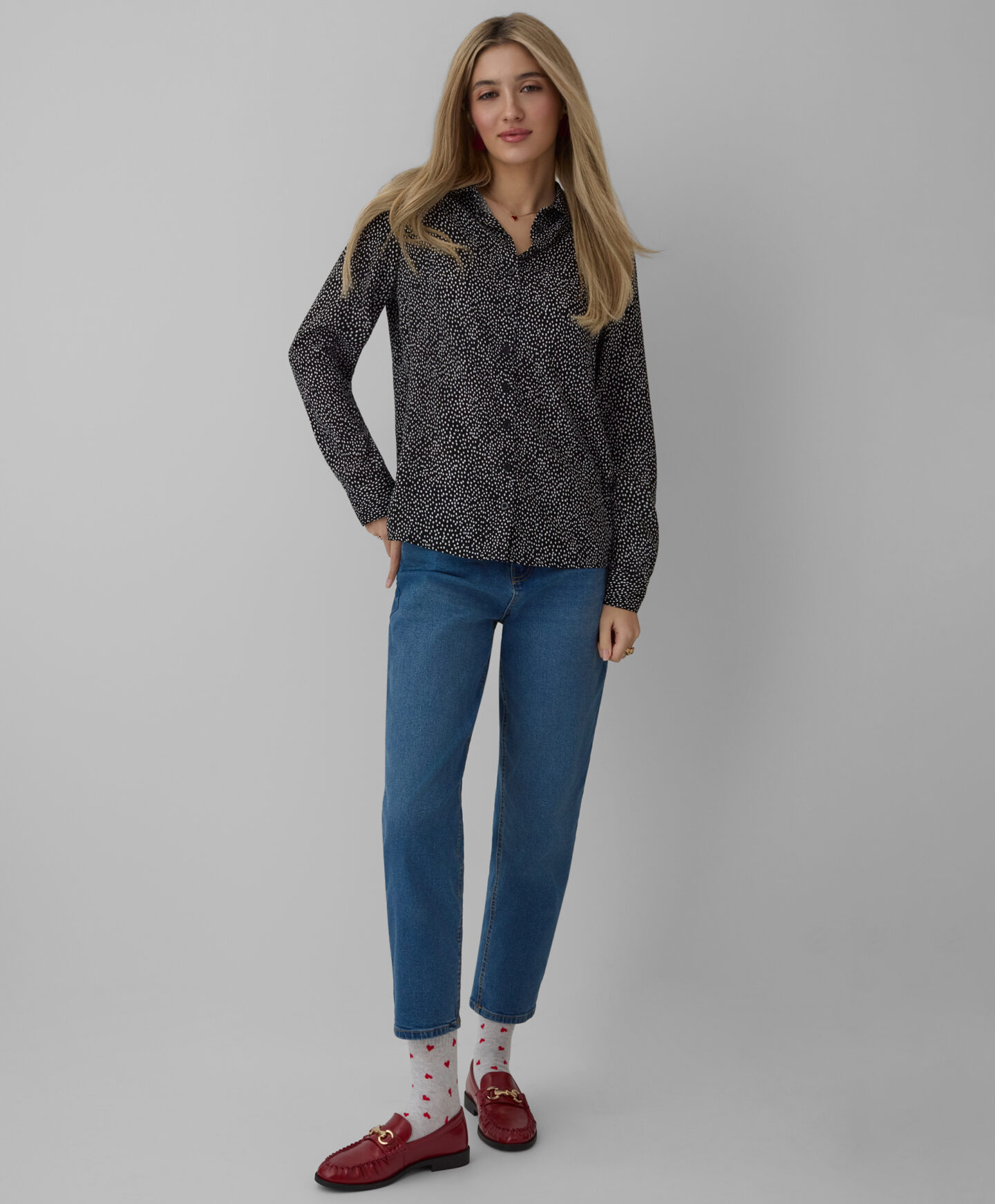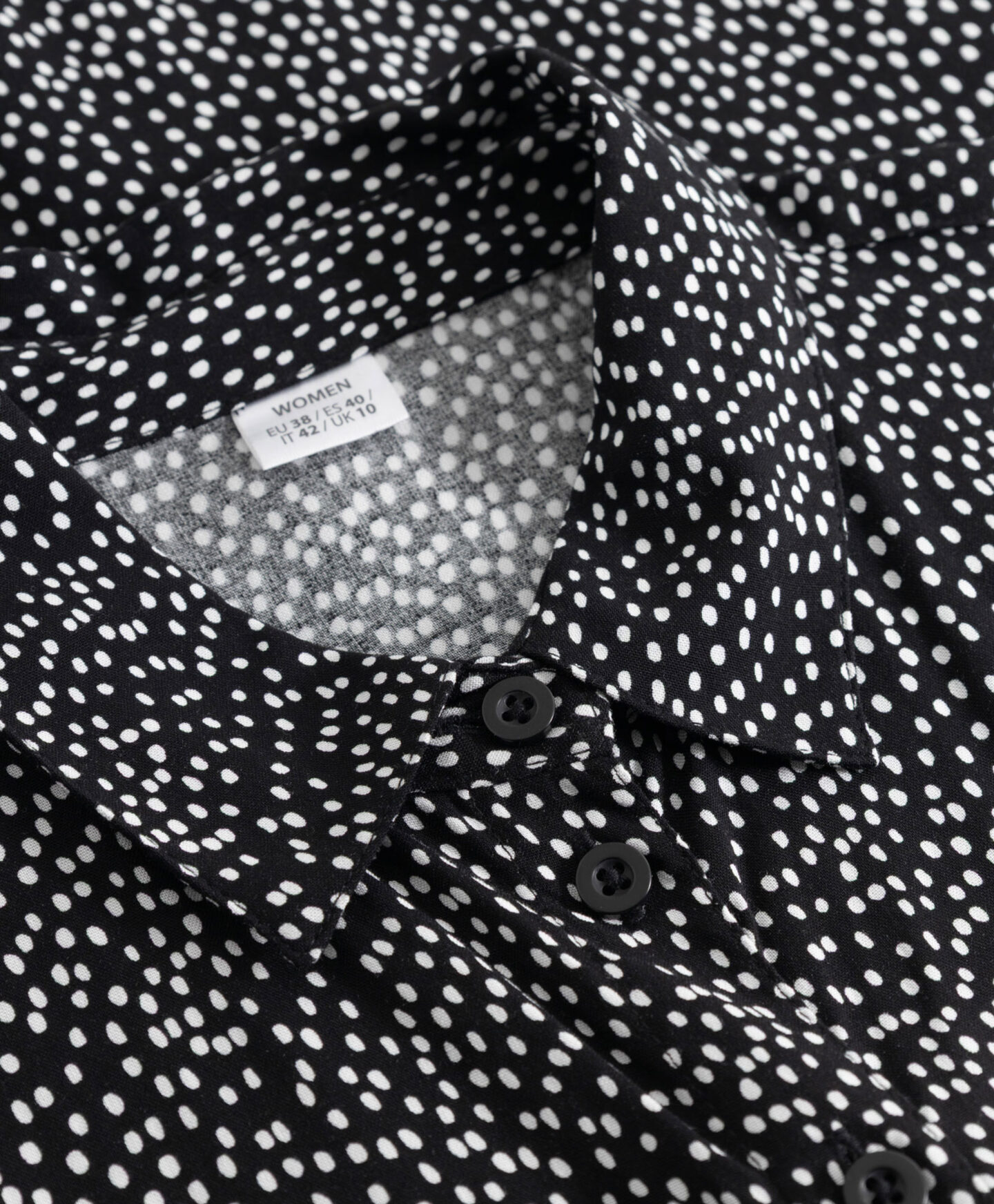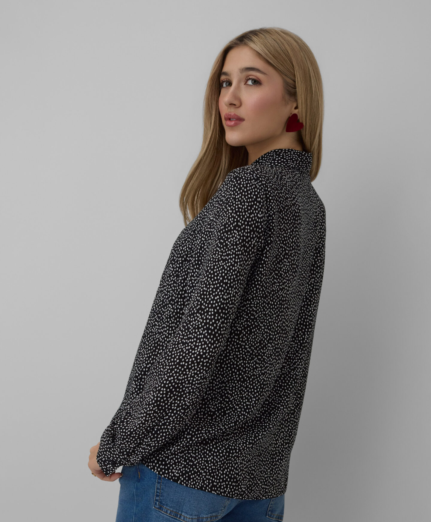 Lasciati conquistare dall’eleganza di questa camicia nera da donna, realizzata con una fantasia particolare e perfetta per chi ama unire stile e comfort. Il tessuto leggero e morbido garantisce una vestibilità impeccabile, mentre il motivo unico dona carattere e personalità al tuo look. Ideale per ogni occasione, dalla giornata in ufficio alle uscite con le amiche, questa camicia si abbina facilmente a jeans, gonne o pantaloni eleganti.