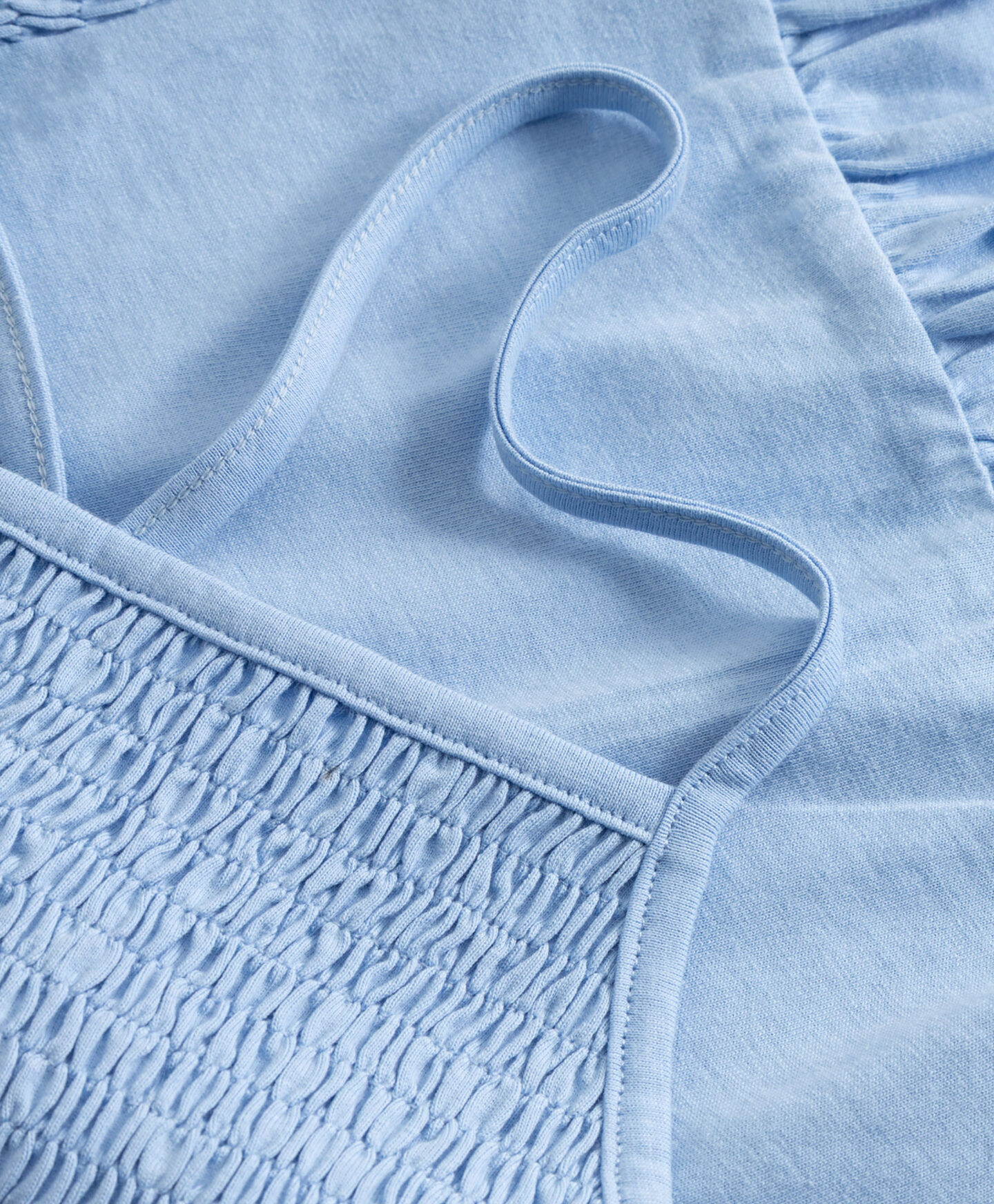 Porta un tocco di freschezza nel guardaroba estivo con questa canotta azzurra da ragazza in 100% cotone. Morbida e traspirante, garantisce il massimo comfort anche nelle giornate più calde. Le delicate arricciature donano un tocco femminile e alla moda, perfetto per look estivi semplici ma d’effetto. Ideale da indossare con una gonnellina o un paio di shorts, questa canottiera è un must-have per le giovani fashioniste!