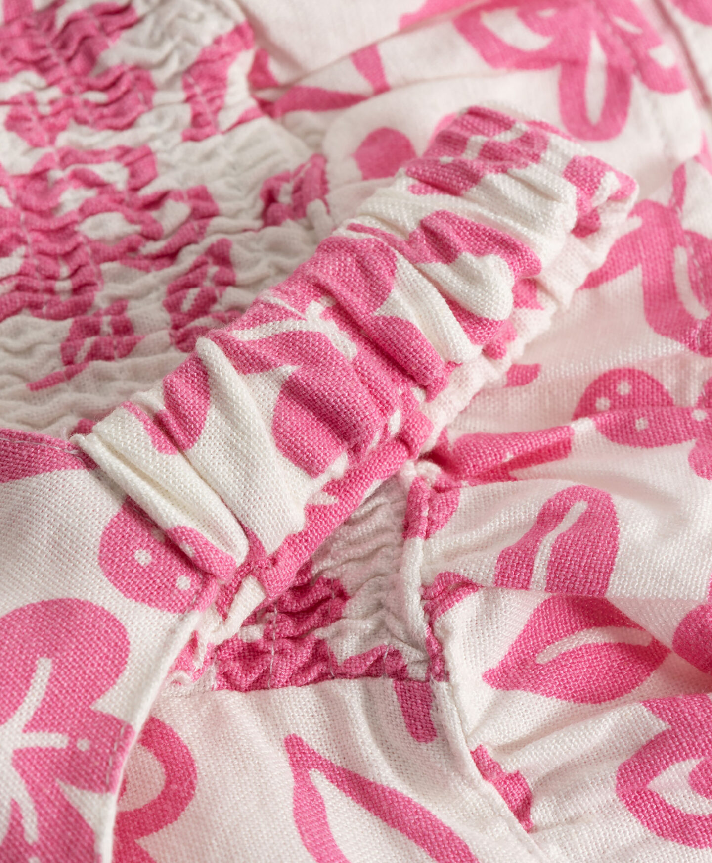 Aggiungi un tocco di dolcezza e stile al look della tua piccola con questa canotta rosa e bianca da bambina, impreziosita da un delicato volant. Realizzata con una morbida miscela di viscosa e lino, garantisce comfort e libertà di movimento. Il motivo floreale e il dettaglio del volant la rendono irresistibile e perfetta da abbinare a jeans classici, una gonna leggera o ai pantaloni floreali della stessa collezione. Questo top è la scelta ideale per giornate estive spensierate!