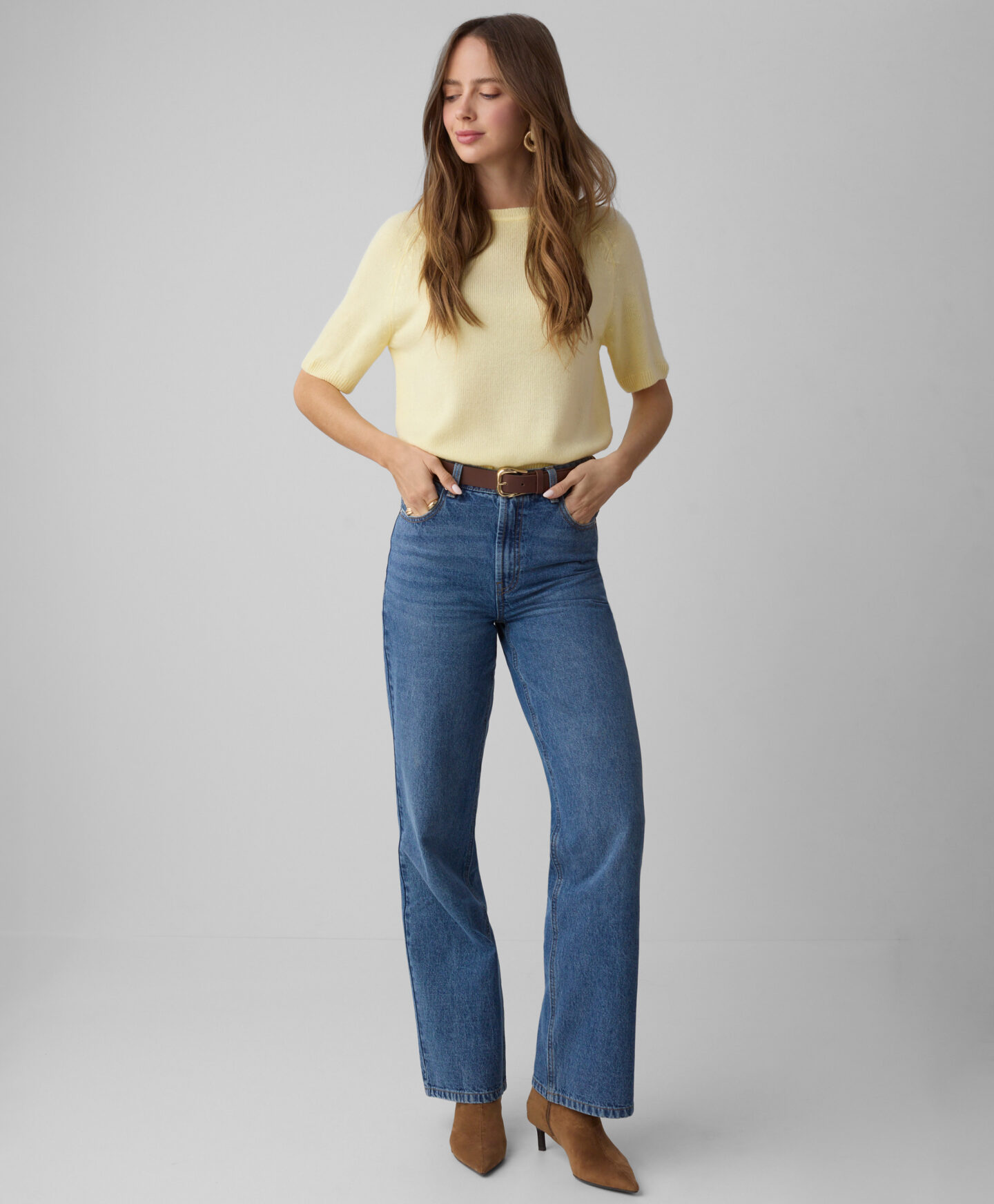 Rendi ogni occasione speciale con questi jeans wide leg da donna, realizzati in 100% cotone per garantire comfort in ogni momento. Le loro linee ampie e fluide si adattano perfettamente a qualsiasi silhouette, donando un tocco di eleganza. Perfetti da abbinare a una t-shirt oversize per un look casual o a una camicia bianca per un outfit più raffinato, questi jeans sono ideali per l’ufficio, un appuntamento romantico o una serata con le amiche. Il loro colore blu intenso offre infinite possibilità di styling, rendendoli un must-have per il tuo guardaroba.