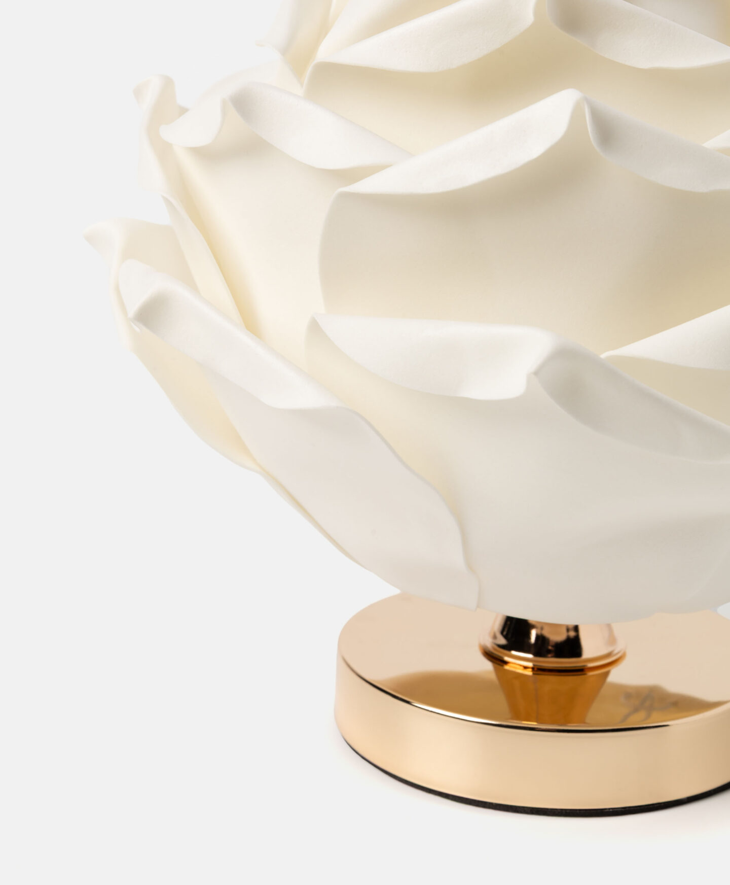 Aggiungi un tocco di magia alla tua casa con questa lampada da tavolo a forma di fiore, un vero gioiello di design. Il paralume, che ricorda un delicato bocciolo chiuso, è composto da petali che diffondono una luce calda e avvolgente, perfetta per creare un’atmosfera accogliente in soggiorno o in camera da letto. La base dorata aggiunge un tocco di eleganza, rendendo questa lampada adatta sia a interni classici che moderni.