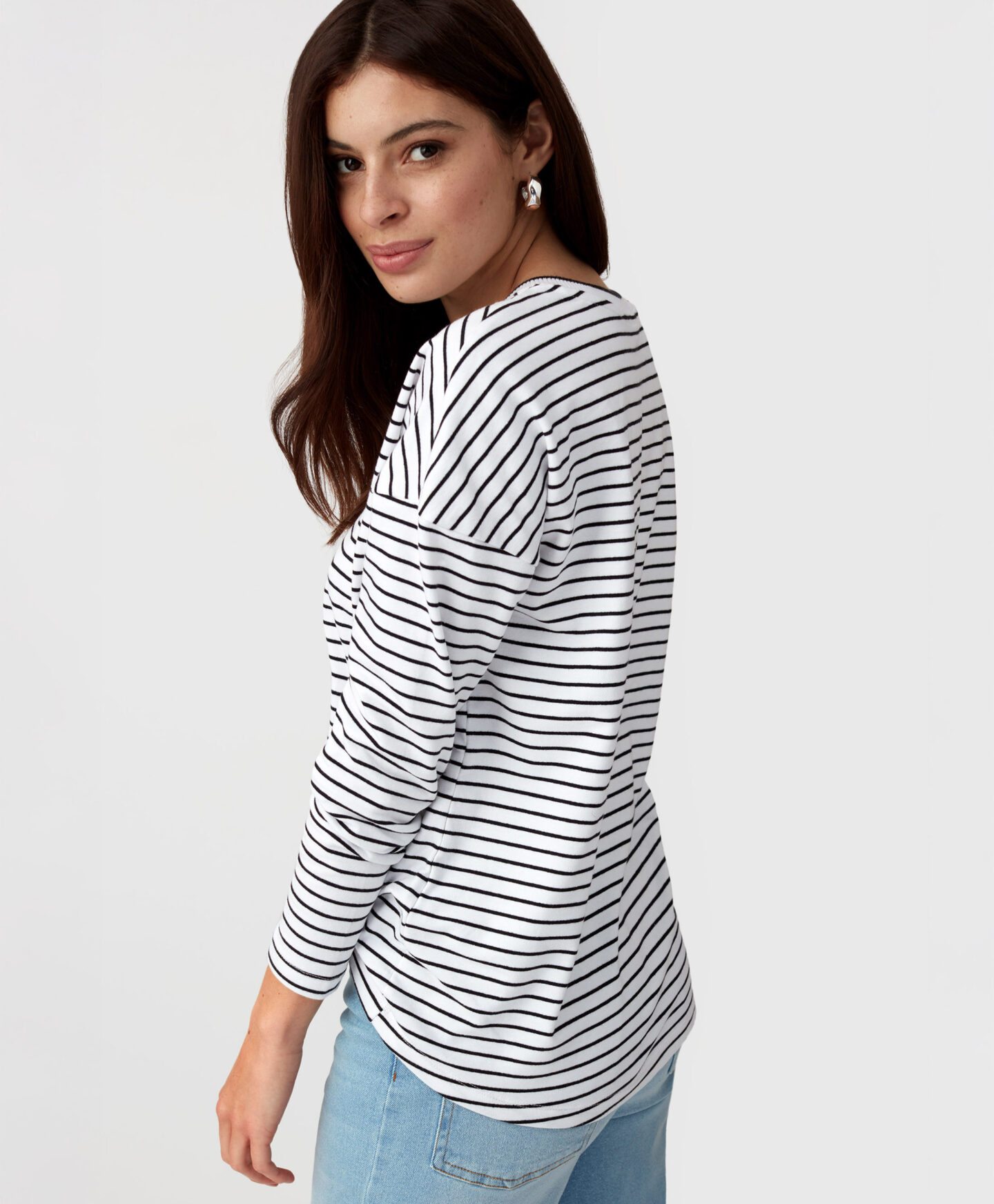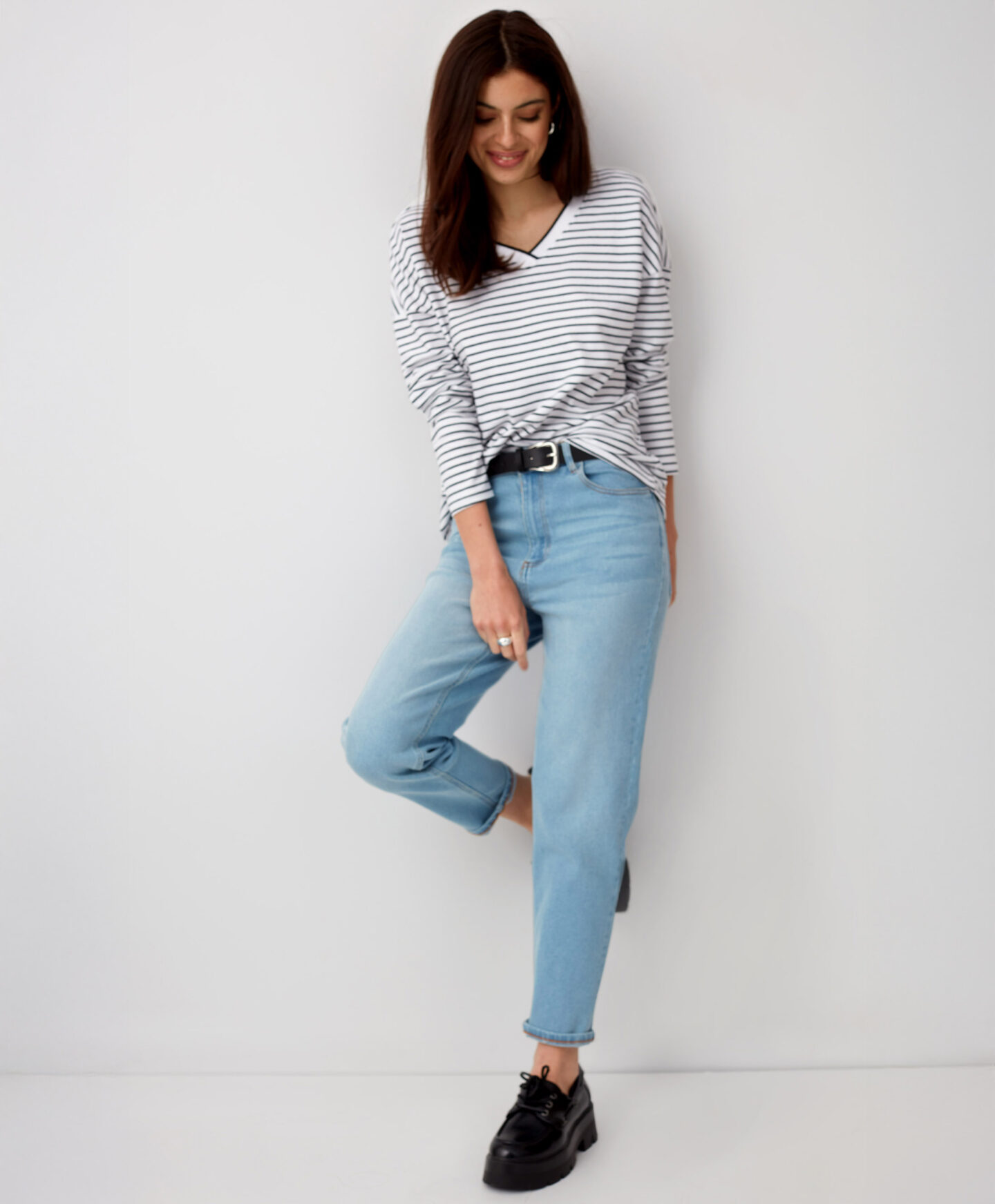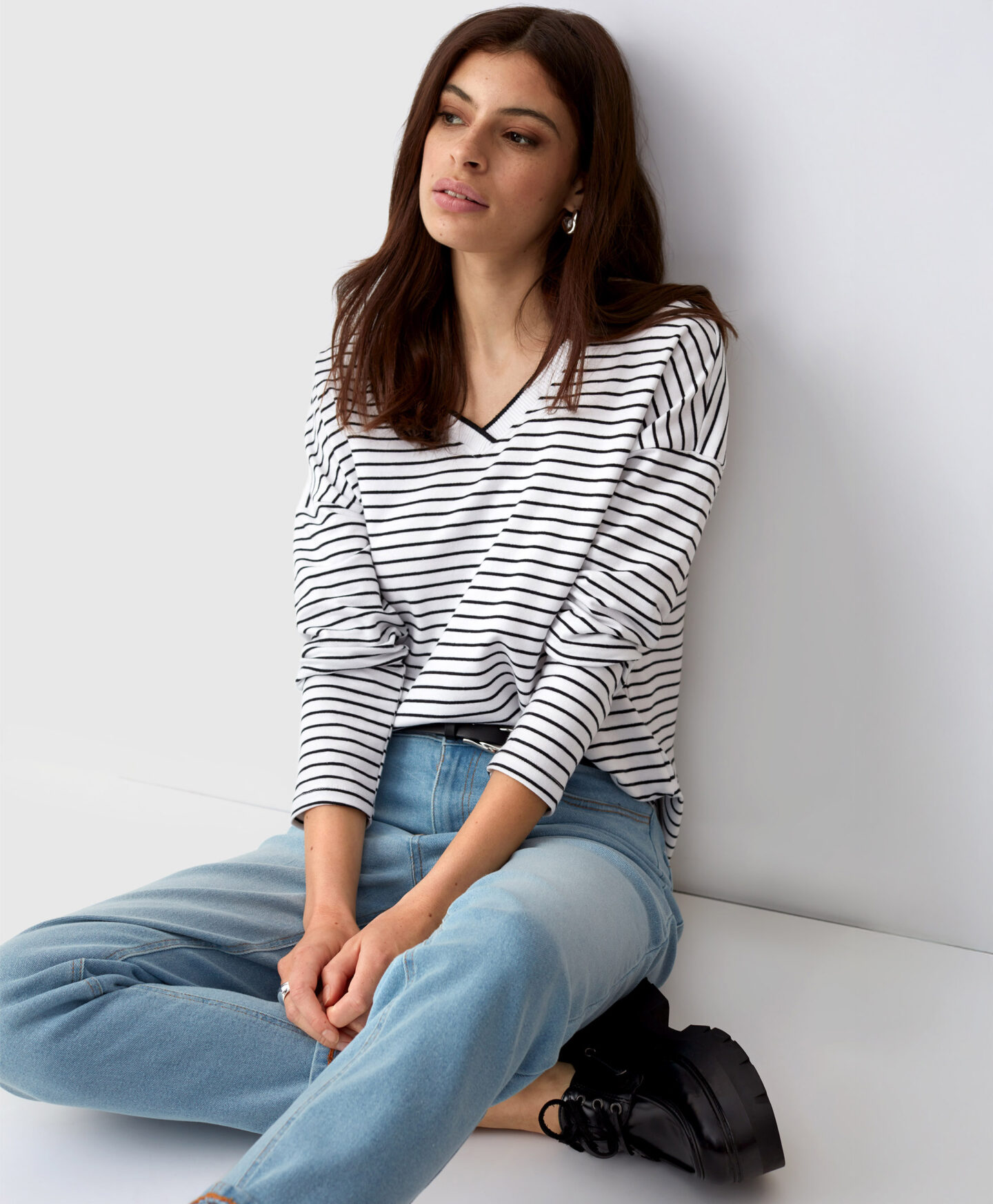 Aggiungi un tocco di stile al tuo guardaroba con questa maglia a righe da donna con scollo a V, realizzata con un’alta percentuale di cotone per garantire comfort e qualità. Il suo taglio classico si adatta perfettamente sia ai look eleganti che a quelli casual, permettendoti di esprimere la tua personalità in ogni occasione. Disponibile nelle taglie dalla S alla XXL, questa maglietta è il capo versatile che non può mancare nel tuo armadio.