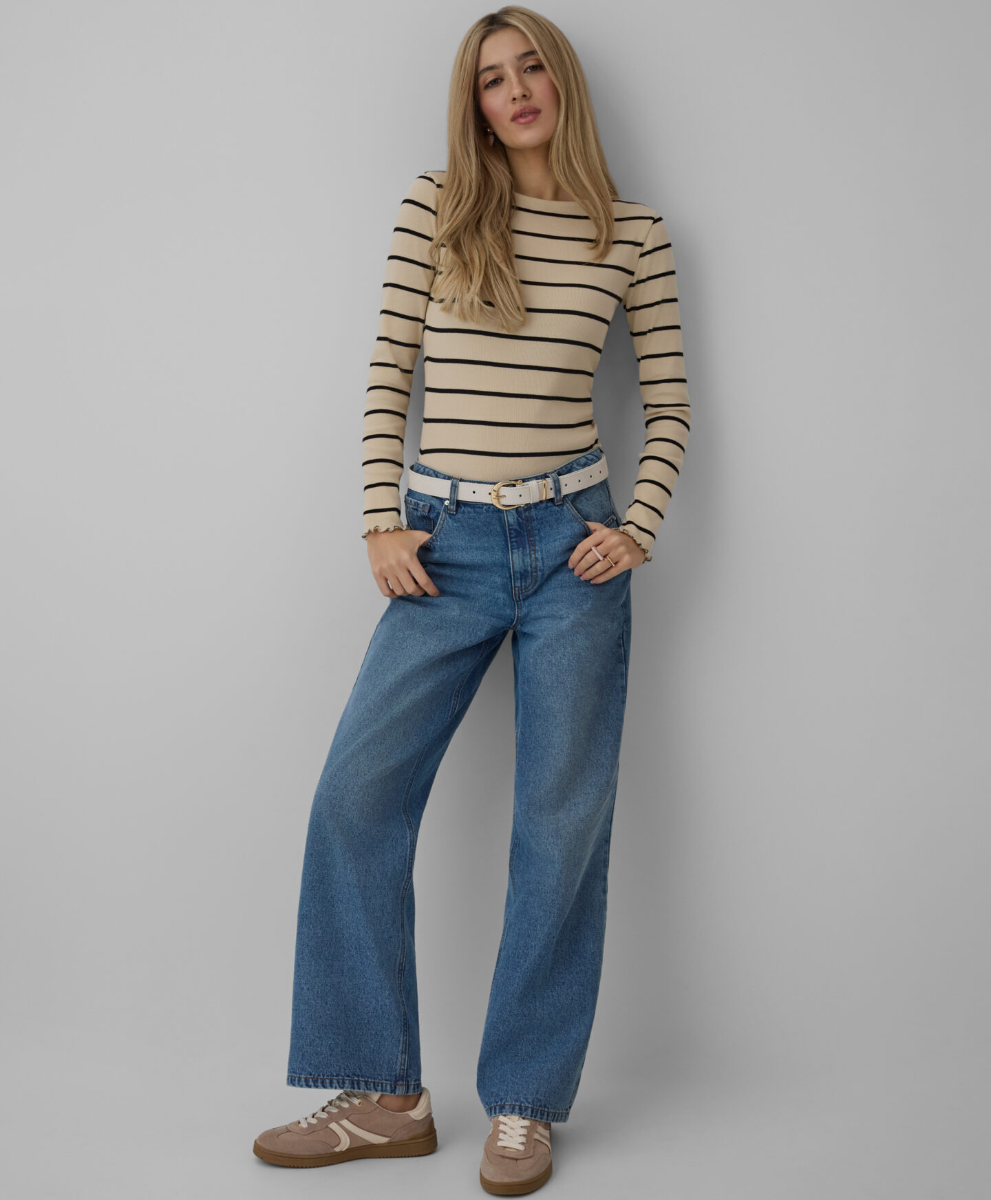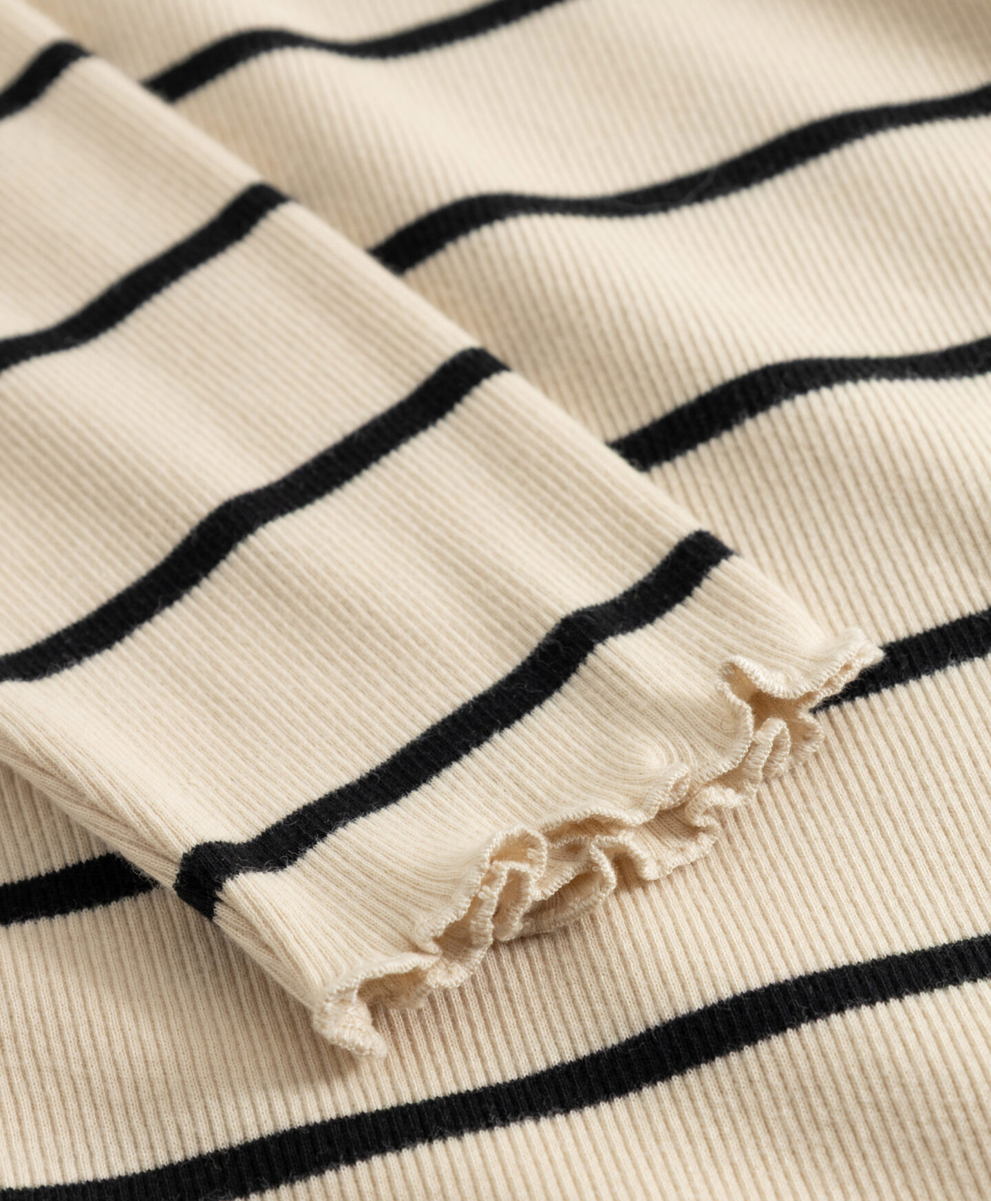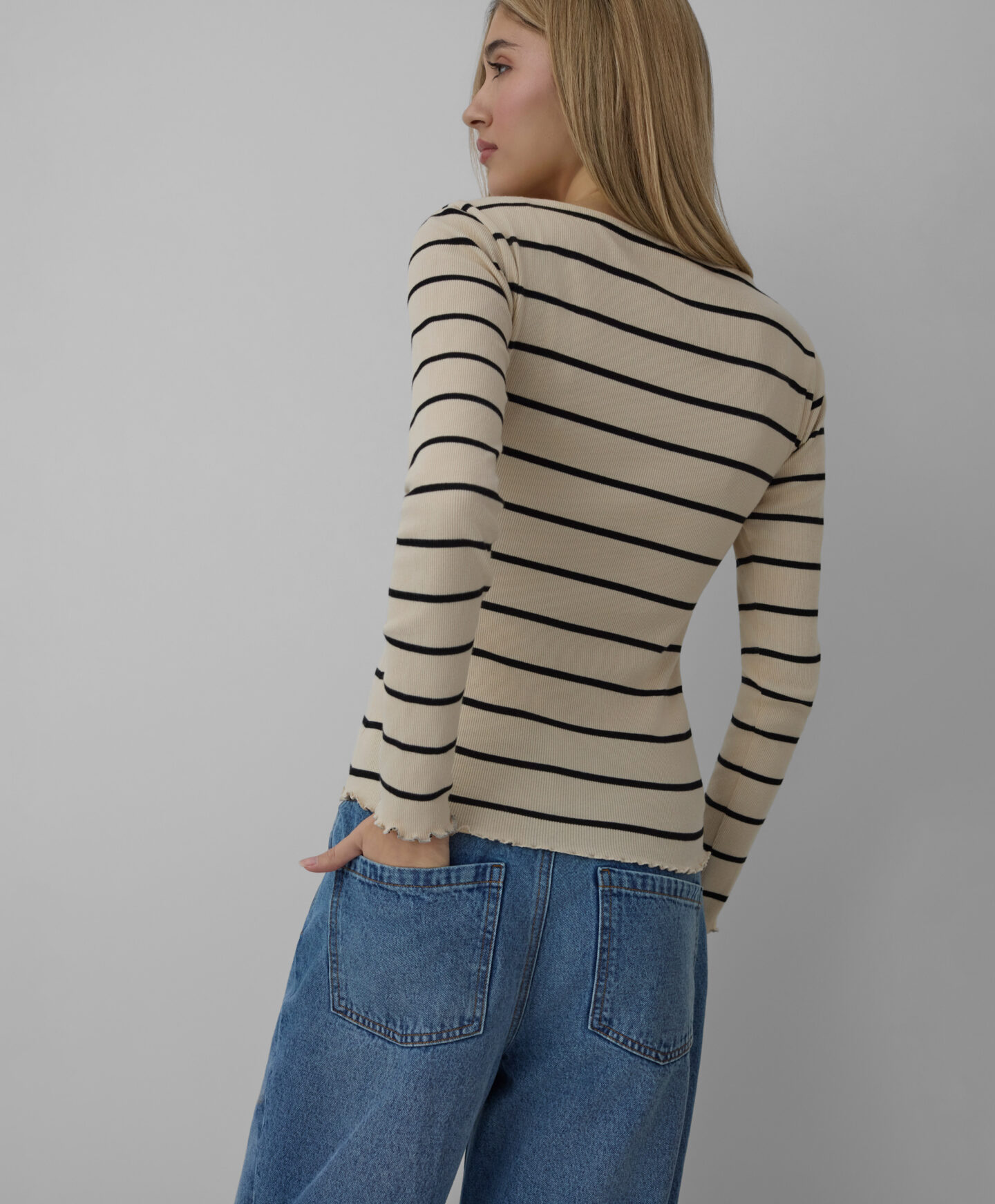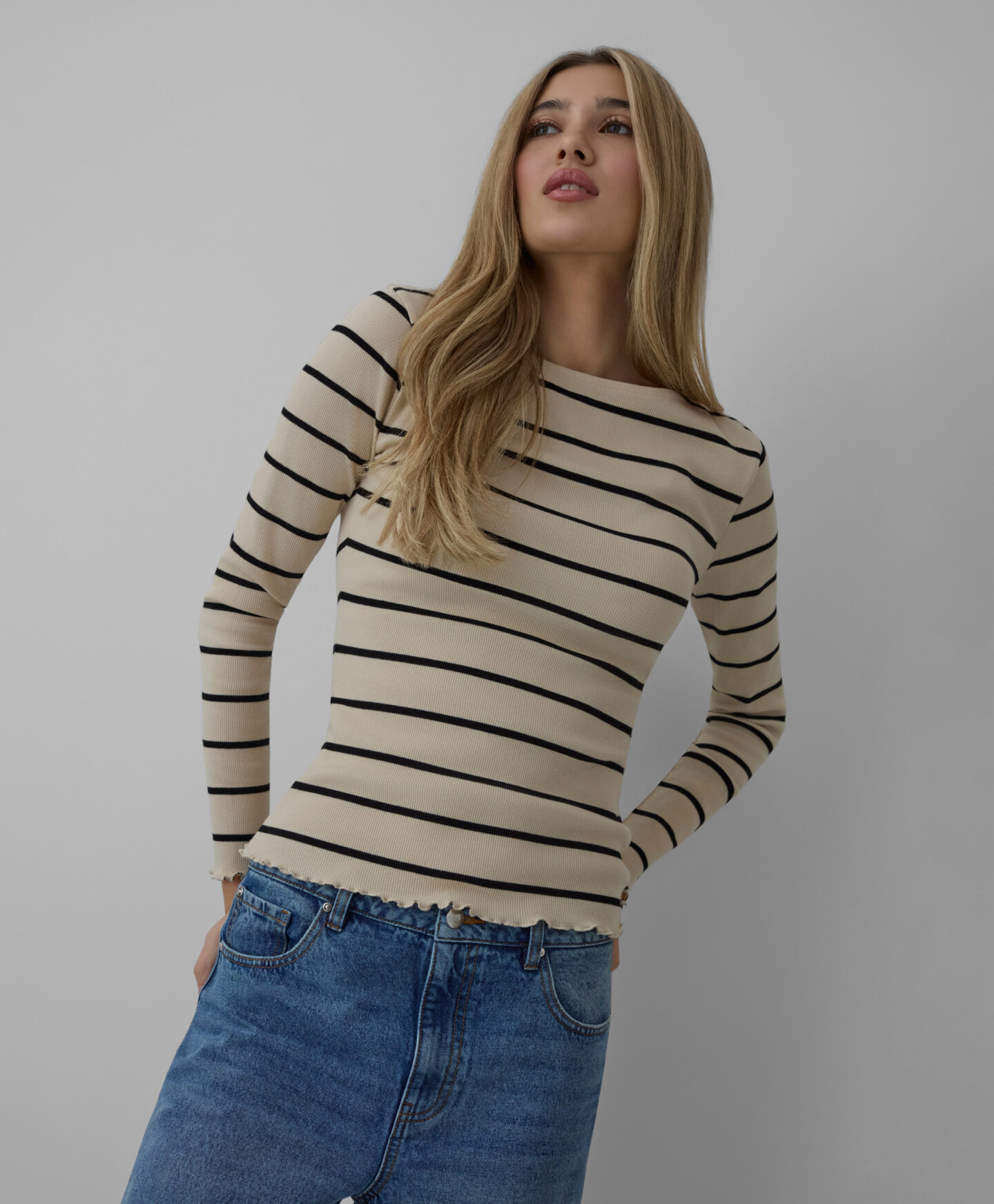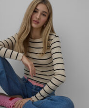 Aggiungi un tocco di eleganza al tuo stile con questa maglia beige a righe da donna, realizzata in cotone per una vestibilità perfetta. Il motivo a righe aggiunge un tocco di raffinatezza, rendendola ideale per completare qualsiasi outfit con jeans casual o pantaloni più eleganti. Disponibile in 2 colori, questa maglia è un must-have per il tuo guardaroba.