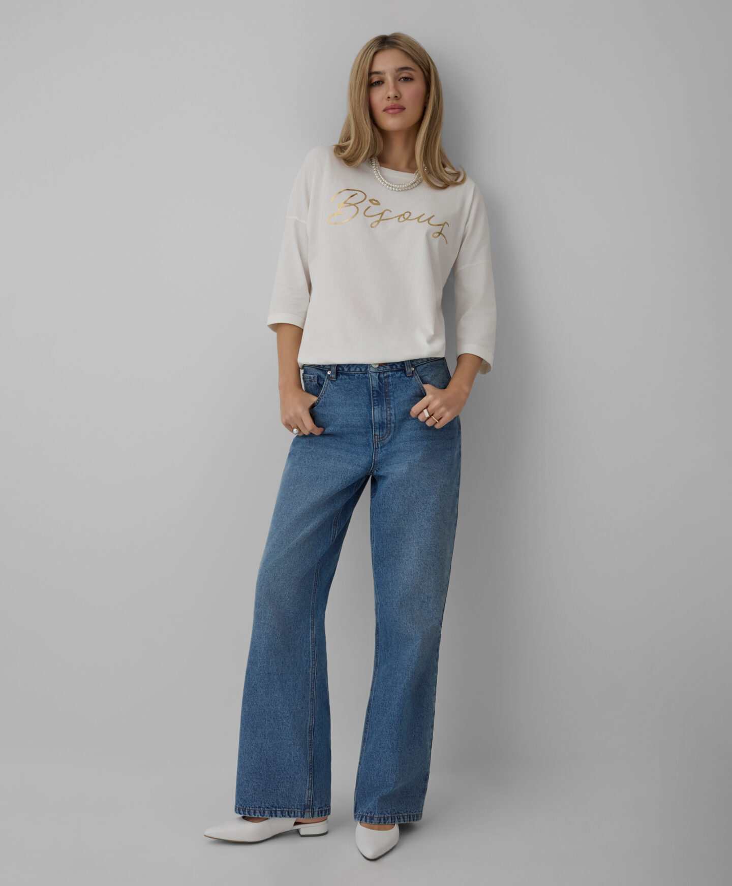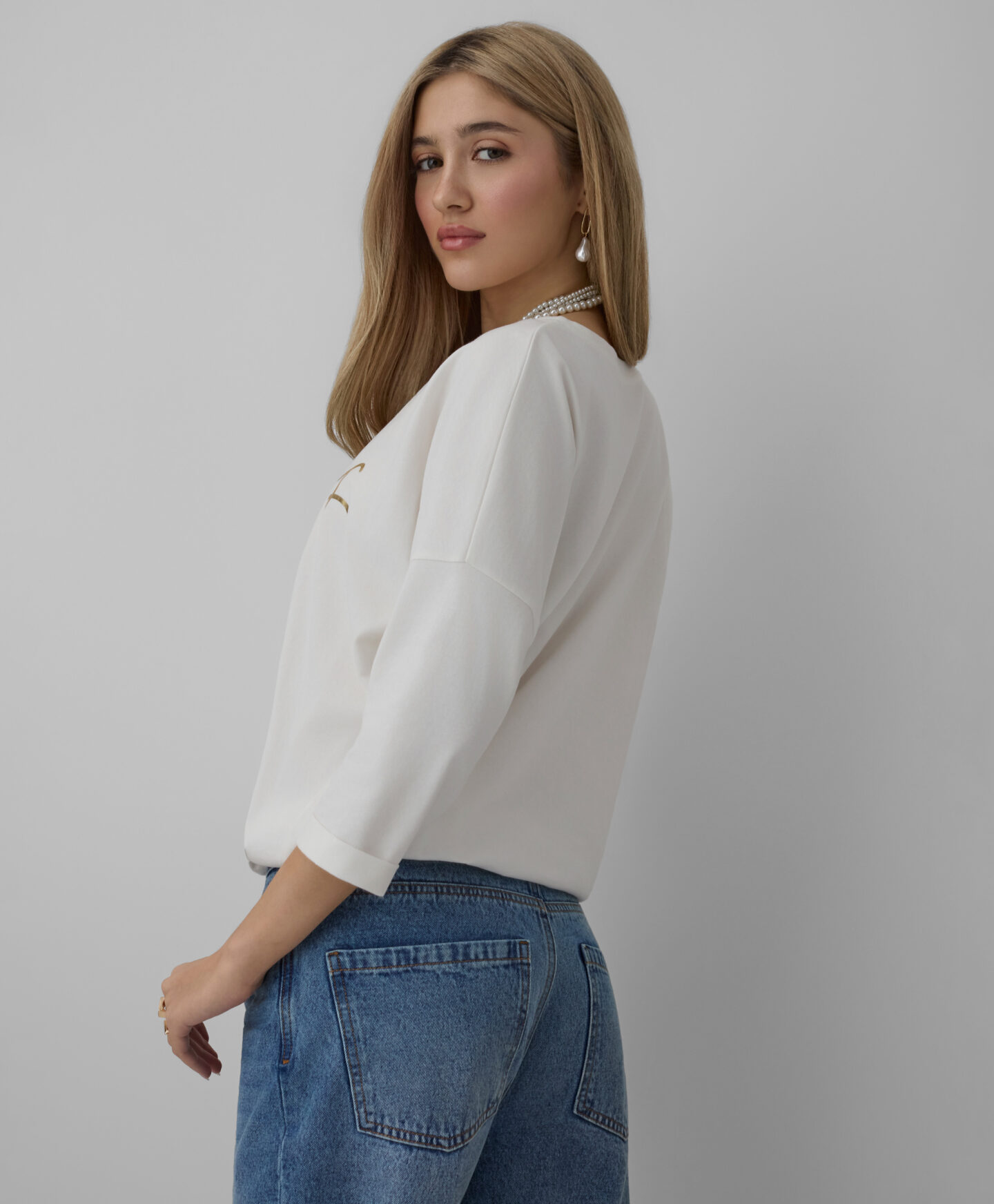 Regalati un incredibile comfort con questa maglia bianca da donna in 100% cotone, arricchita da un elegante dettaglio sul davanti. Morbida e delicata sulla pelle, avvolge il corpo con leggerezza e garantisce libertà di movimento in ogni occasione. Il suo design versatile si abbina perfettamente ai jeans per un look casual e impeccabile e la rende ideale per le tue giornate più dinamiche.