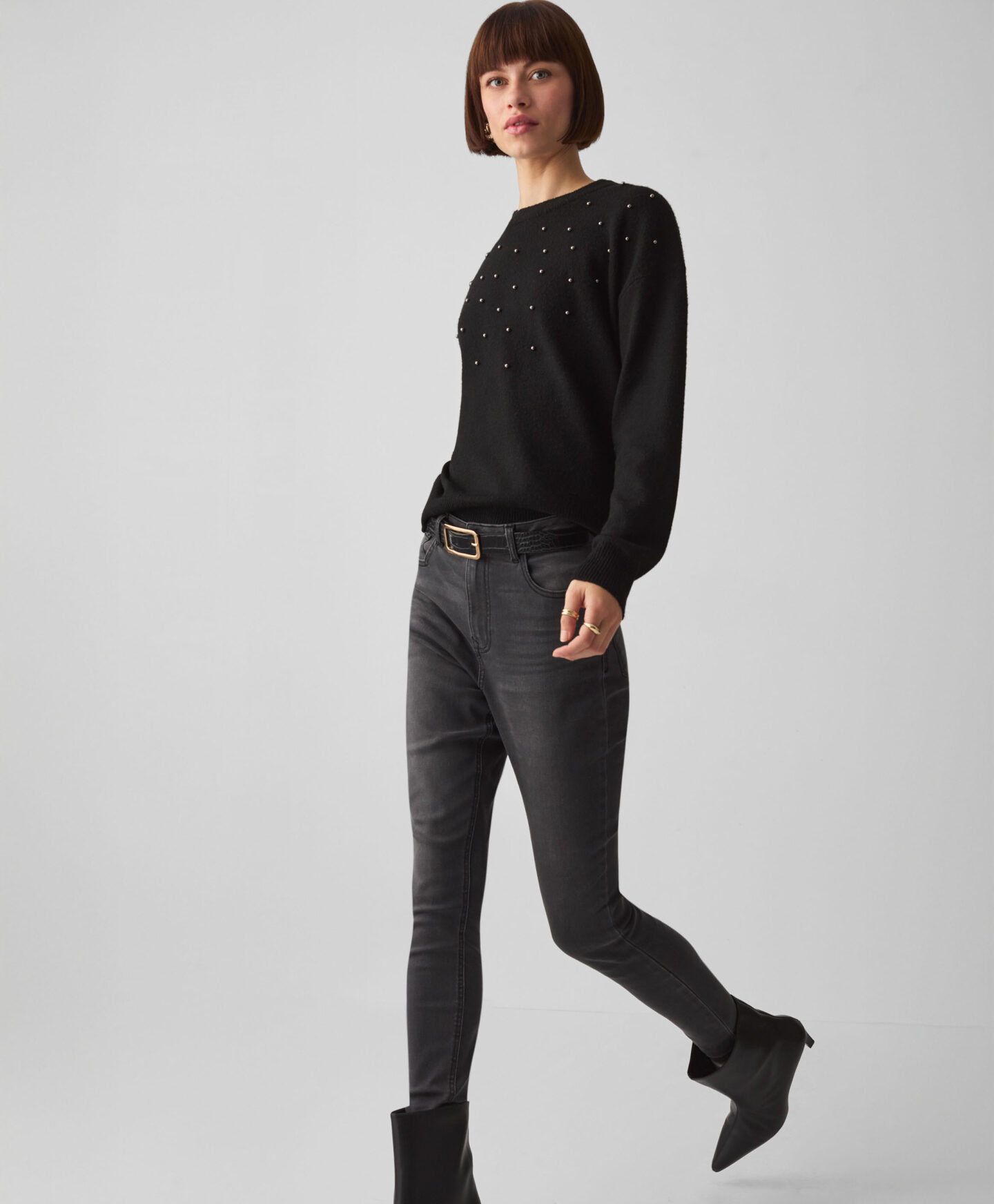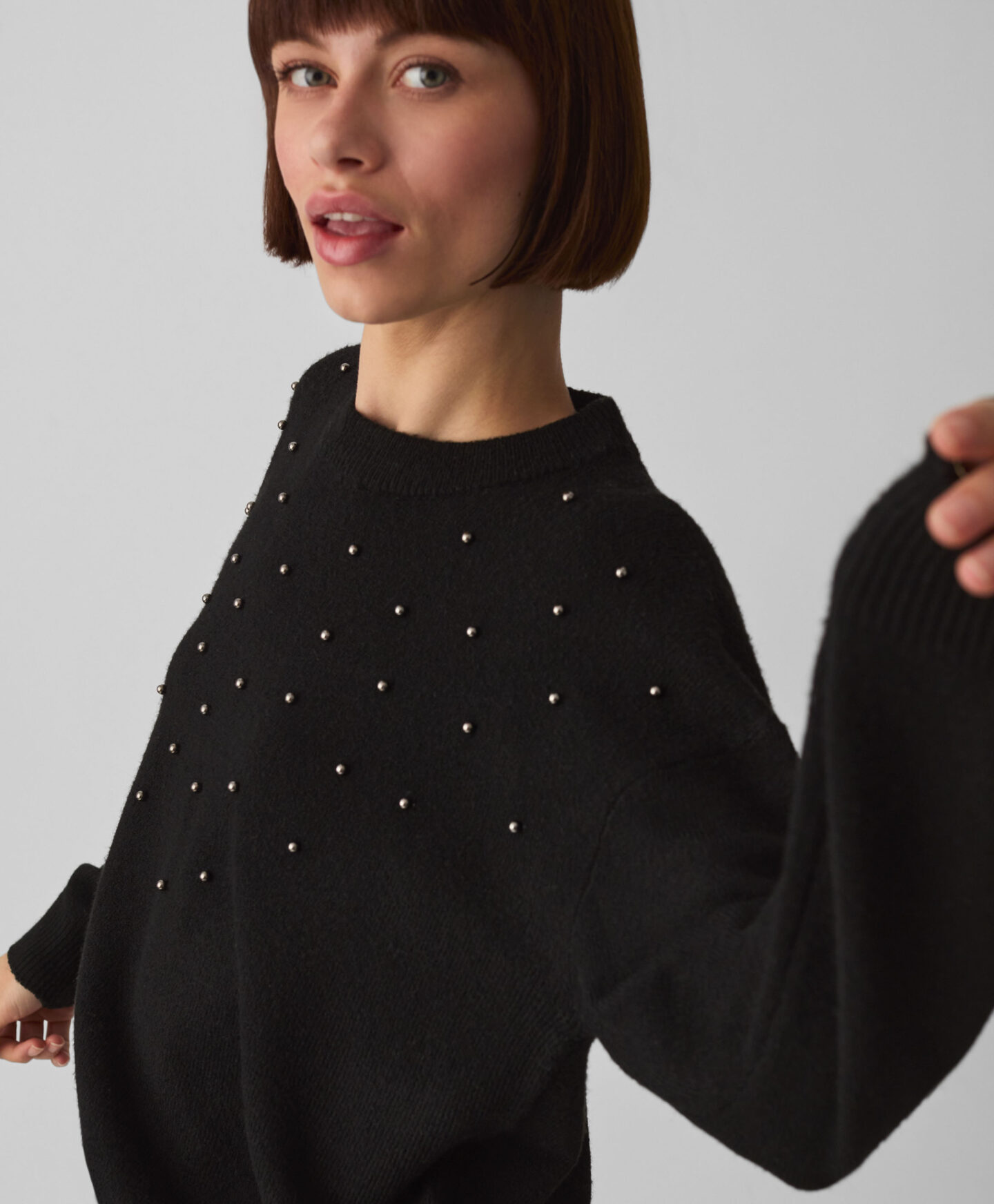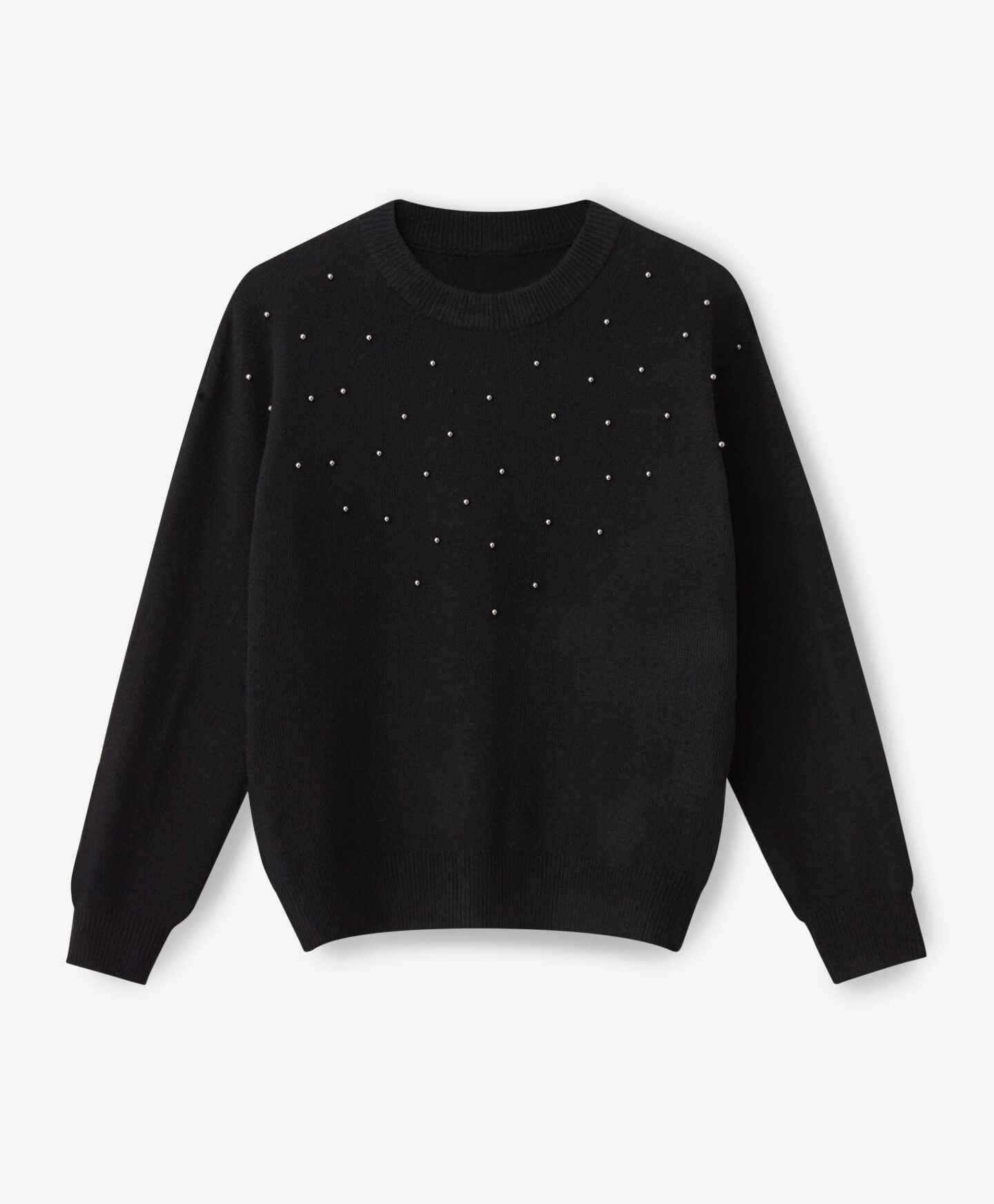 Rendi speciale ogni occasione con questo maglione nero da donna, impreziosito da delicate perle che donano un tocco di raffinatezza al tuo stile. Morbido al tatto e avvolgente, è il capo perfetto per affrontare le giornate più fredde con eleganza, abbinandolo a una gonna, a un paio di pantaloni o sopra un abito. Ideale per il lavoro o per le serate con le amiche, questo maglione unisce comfort e classe, diventando un elemento imprescindibile nel tuo guardaroba.
