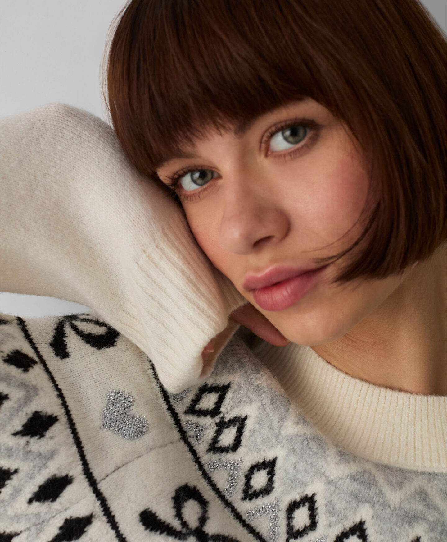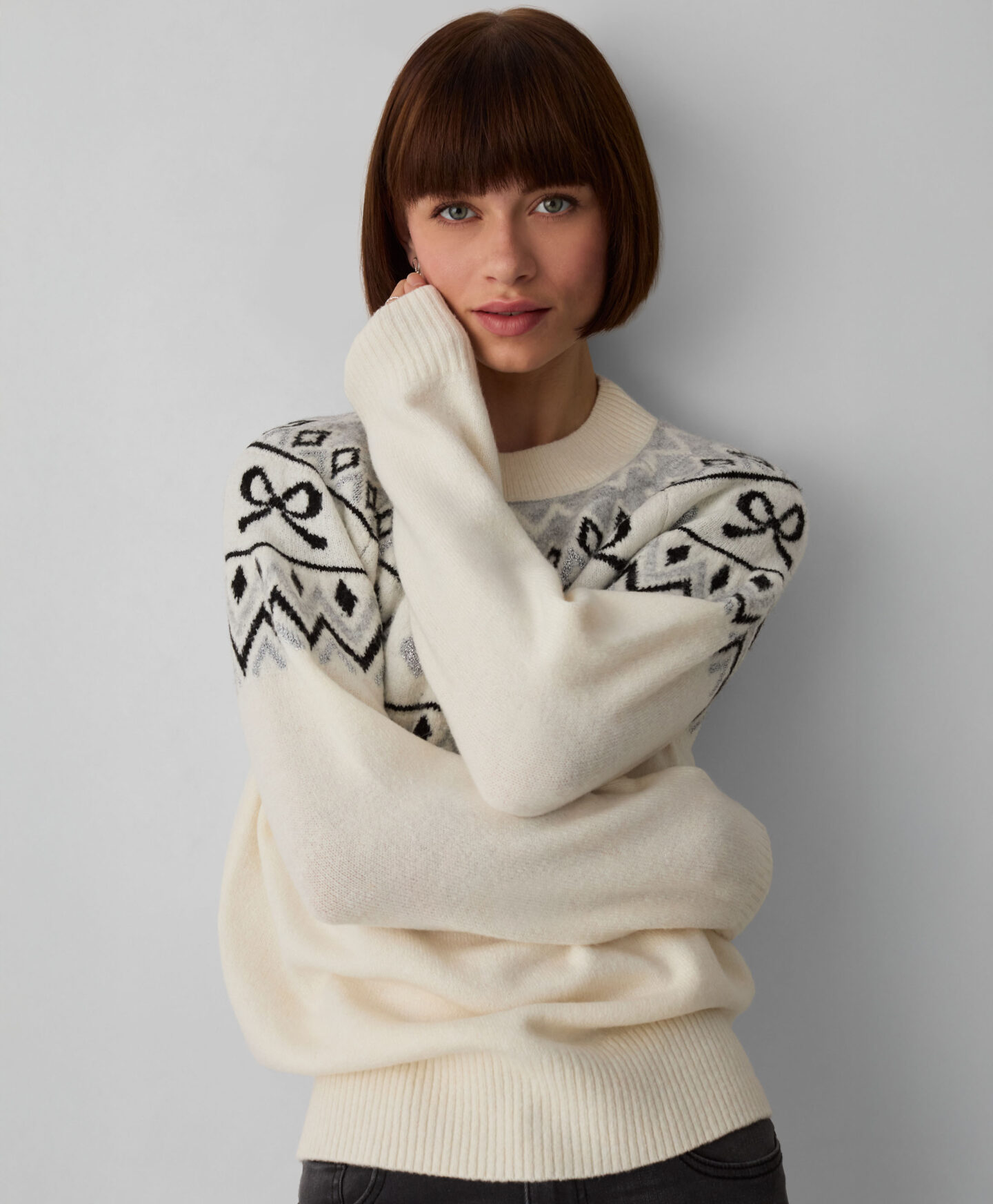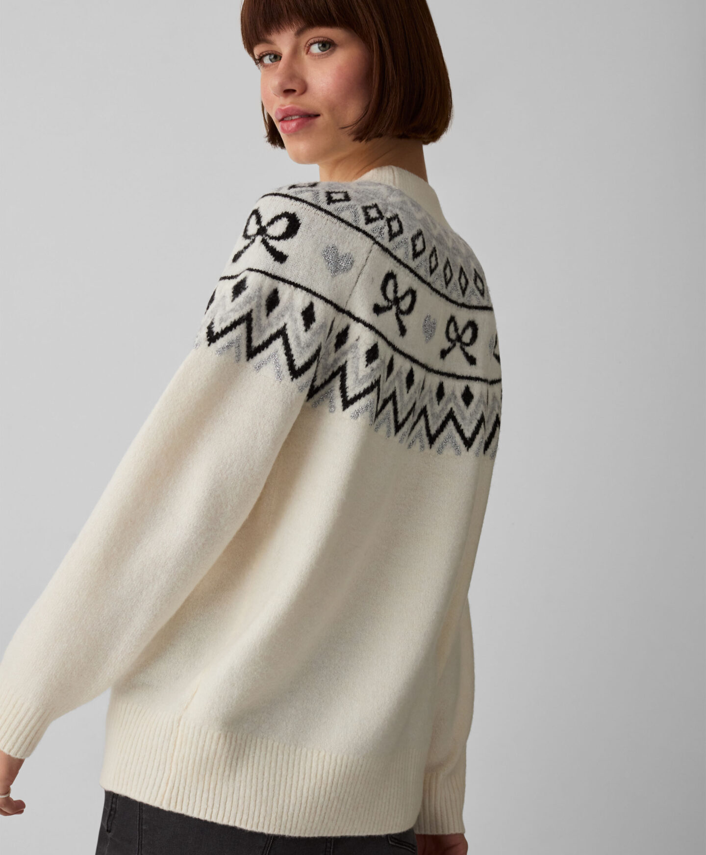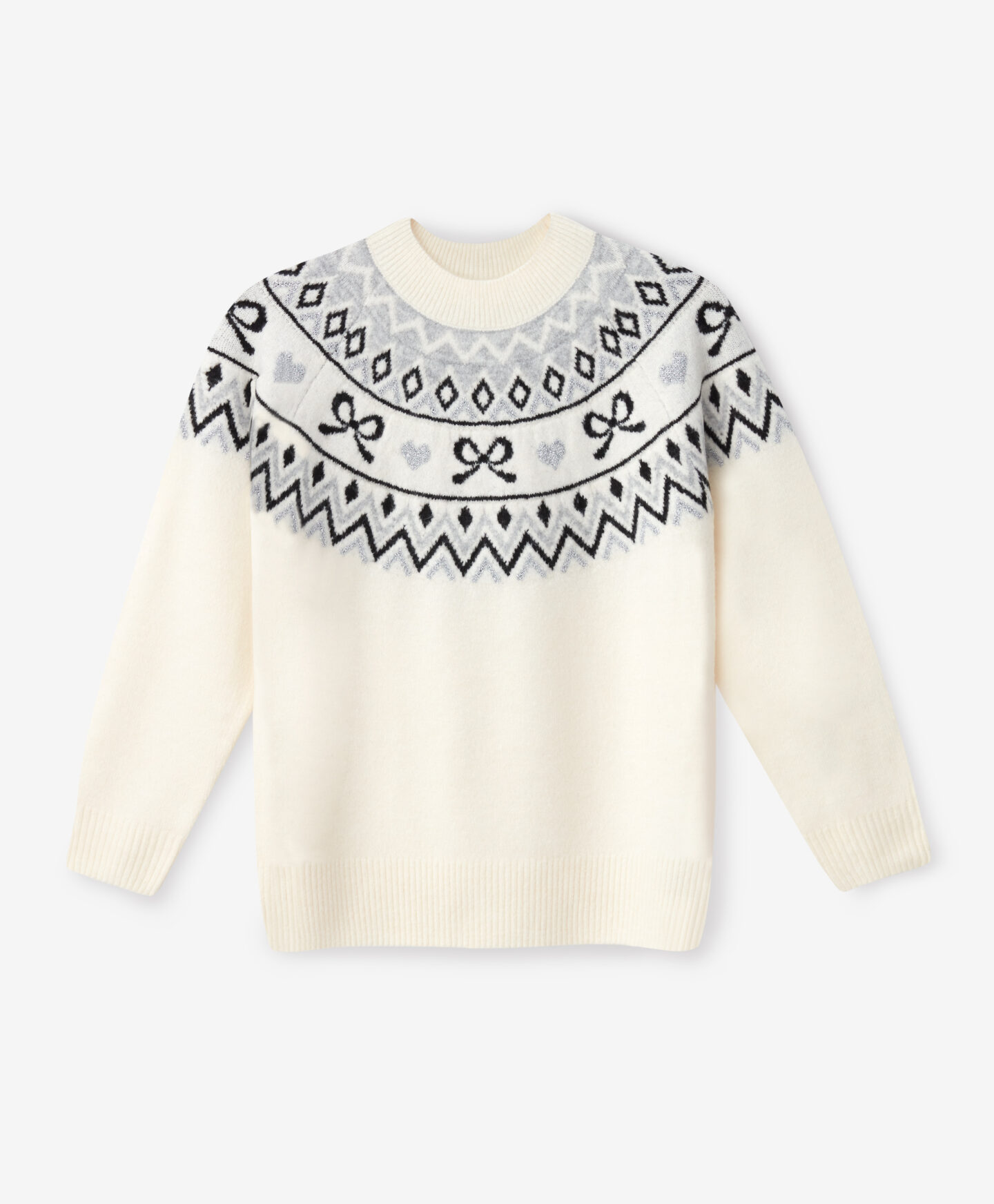 Lasciati avvolgere dal calore e dallo stile di questo maglione color crema da donna, impreziosito da delicati motivi nordici che donano un tocco di fascino. I dettagli grigi e neri creano un contrasto elegante e sofisticato. Perfetto da abbinare a una gonna per un look romantico o a un paio di pantaloni per un outfit più casual, questo maglione sarà sempre la scelta giusta per unire comfort e raffinatezza.