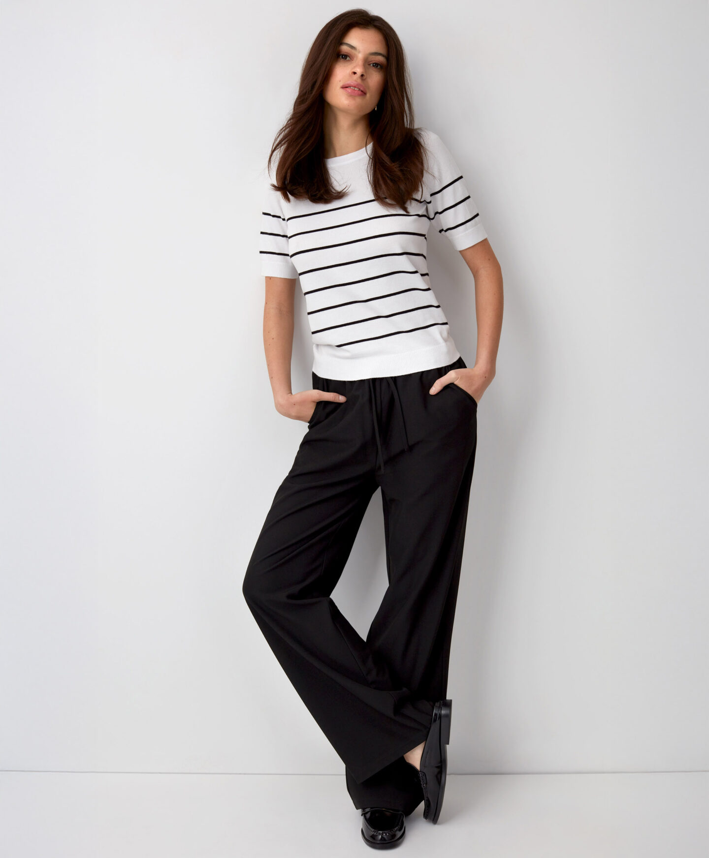 Scopri l’eleganza di questi pantaloni neri da donna, un capo essenziale che non può mancare nel tuo guardaroba. Realizzati per offrire il massimo comfort e una vestibilità impeccabile, si adattano perfettamente alla tua silhouette. Il loro design minimalista li rende estremamente versatili, permettendoti di abbinarli facilmente sia con outfit casual che con look più formali. Perfetti per ogni occasione, dal lavoro alle serate speciali, questi pantaloni sono disponibili nelle taglie dalla 36 alla 44 per soddisfare ogni esigenza di stile.
