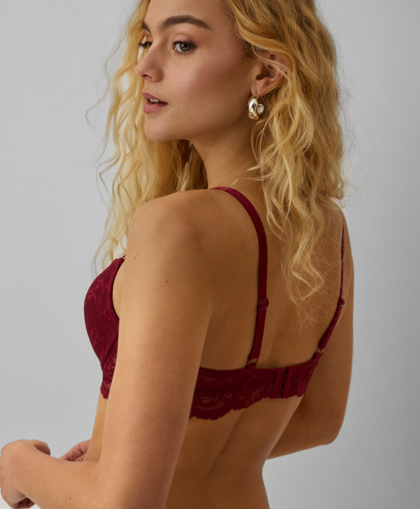 Rendi ogni outfit irresistibile con questo reggiseno push up bordeaux, pensato per esaltare la tua femminilità creando un volume straordinario. Il delicato motivo in pizzo dona un tocco romantico e sofisticato, perfetto per chi desidera sentirsi sensuale e sicura in ogni occasione. Realizzato in materiali ultra morbidi che accarezzano la pelle, garantisce un comfort impareggiabile per tutta la giornata, trasformando anche i capi più semplici in look da urlo.