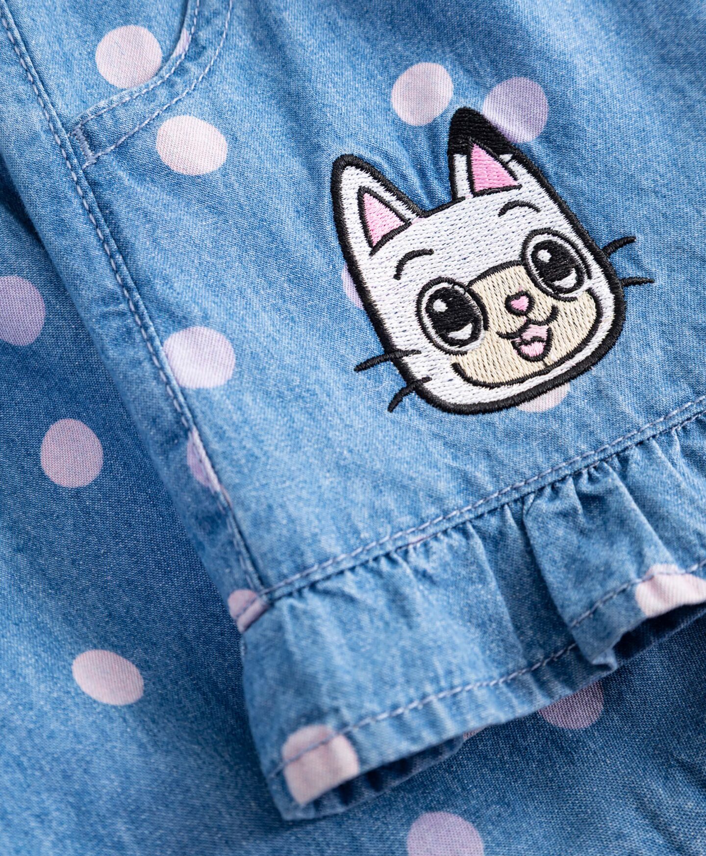 Porta la magia della Casa delle bambole di Gabby nei look della tua piccola con questi shorts blu da bambina, realizzati in morbido cotone 100%. Con comode tasche e vita elastica, offrono libertà di movimento e praticità per ogni avventura. I delicati volant sulle gambe e il motivo a pois aggiungono un tocco di dolcezza, mentre la grafica con il suo personaggio preferito li rende unici. Perfetti per l’asilo, il parco giochi o le passeggiate in famiglia, questi shorts uniscono comfort e stile in un capo irresistibile!