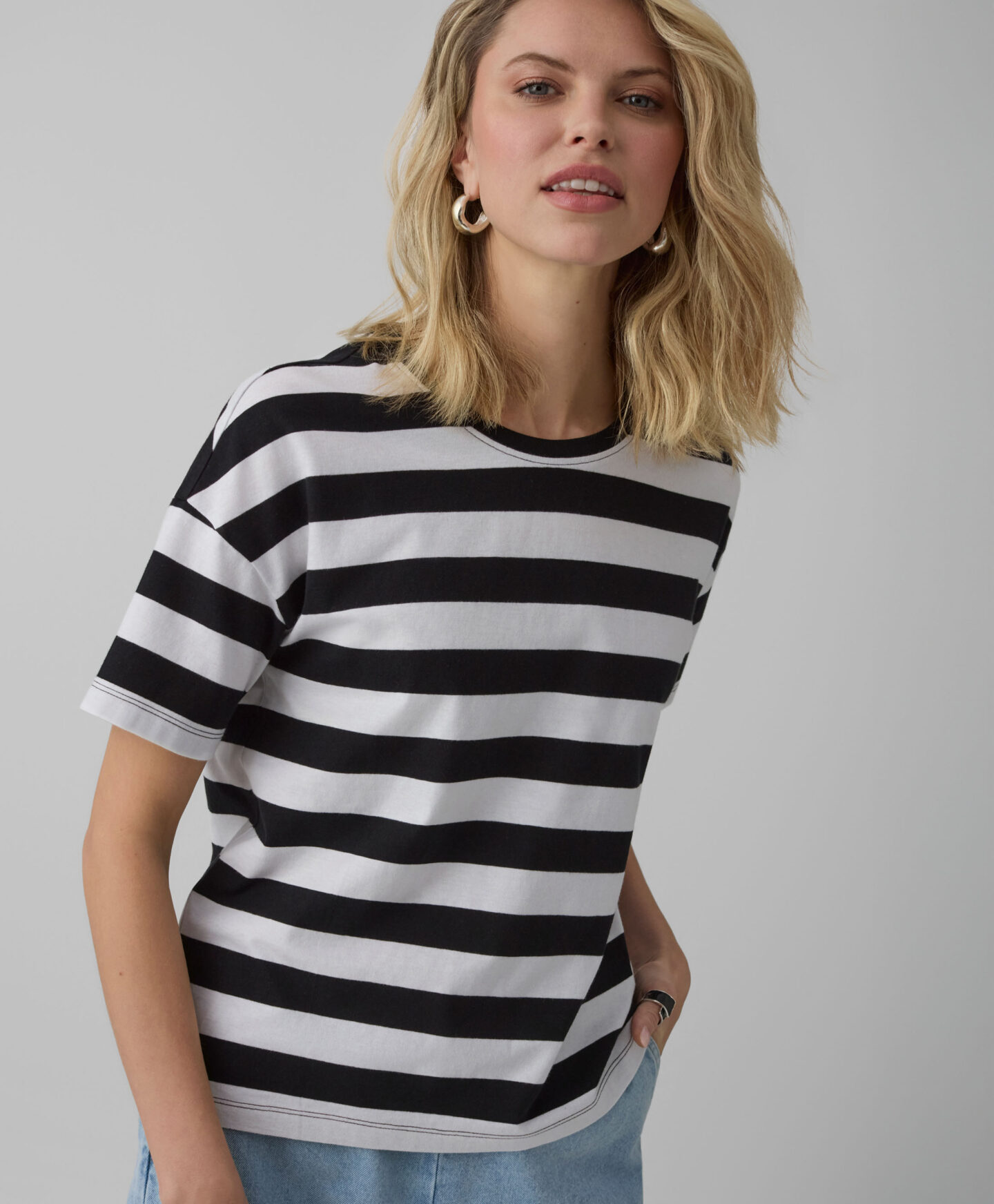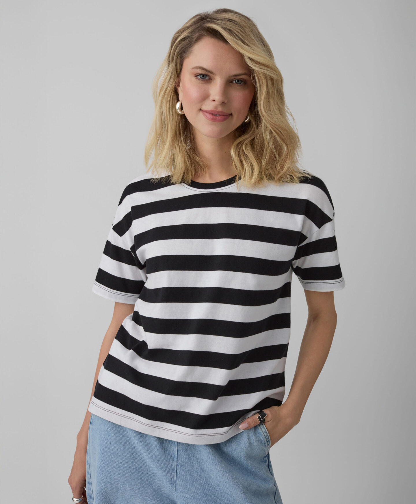 Porta un tocco glamour nel tuo armadio con questa t-shirt a righe bianche e nere da donna, realizzata in morbido cotone. Il taglio comodo e la fantasia classica la rendono perfetta per ogni occasione: abbinala ai jeans per un look casual chic o indossala con una tuta per un momento di relax a casa. Leggera, traspirante e sempre di tendenza, questa maglietta diventerà subito la tua preferita!