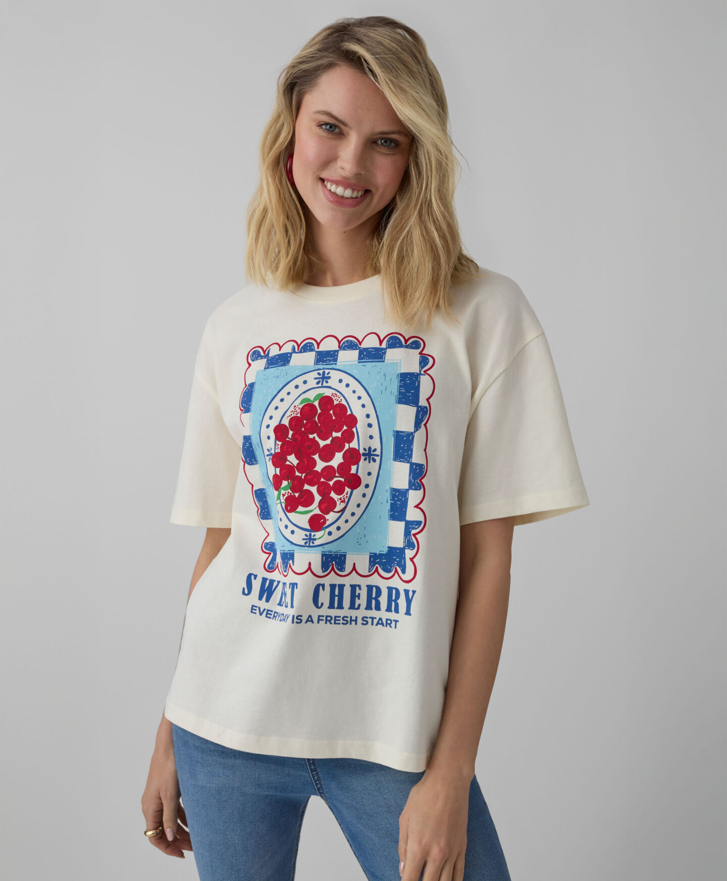 Scopri questa t-shirt beige da donna, realizzata in puro cotone, che unisce comfort e stile! Con la sua stampa originale sul davanti, aggiunge un tocco fresco e trendy a ogni look. Morbida e traspirante, è perfetta per le giornate primaverili o estive: abbinala ai tuoi jeans preferiti e sarai pronta per un caffè con le amiche o una passeggiata al parco. Leggera e versatile, non potrai più farne a meno!