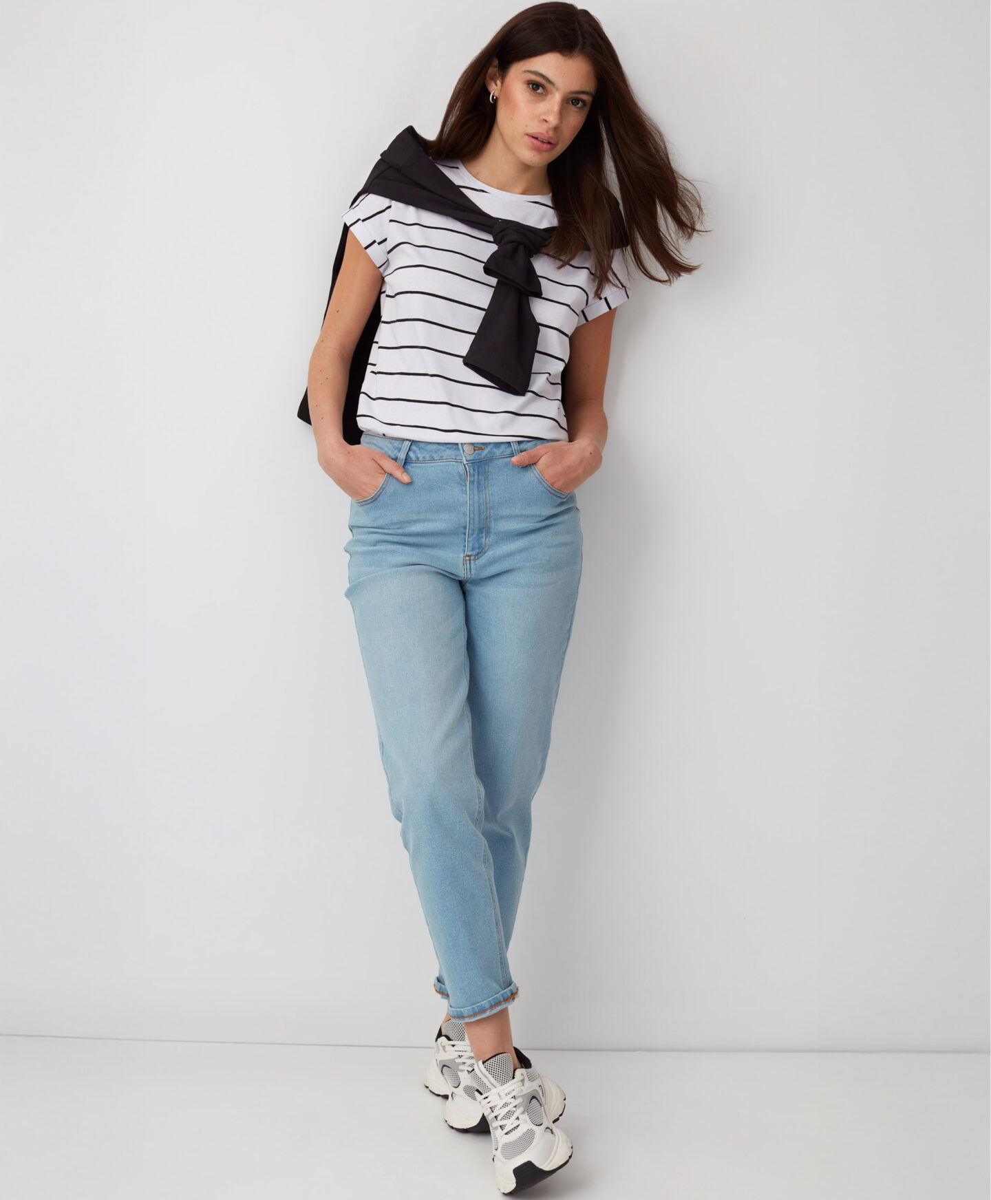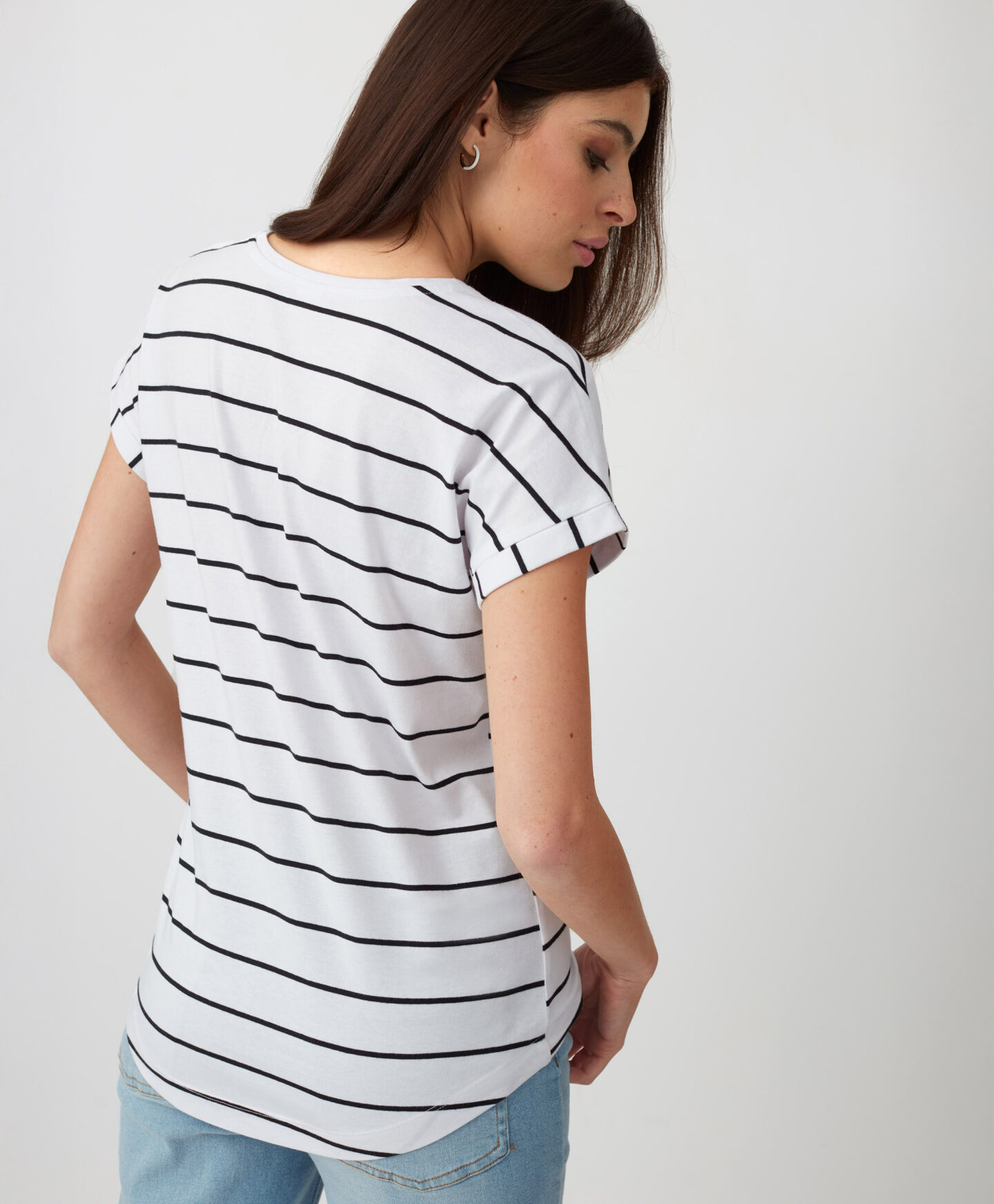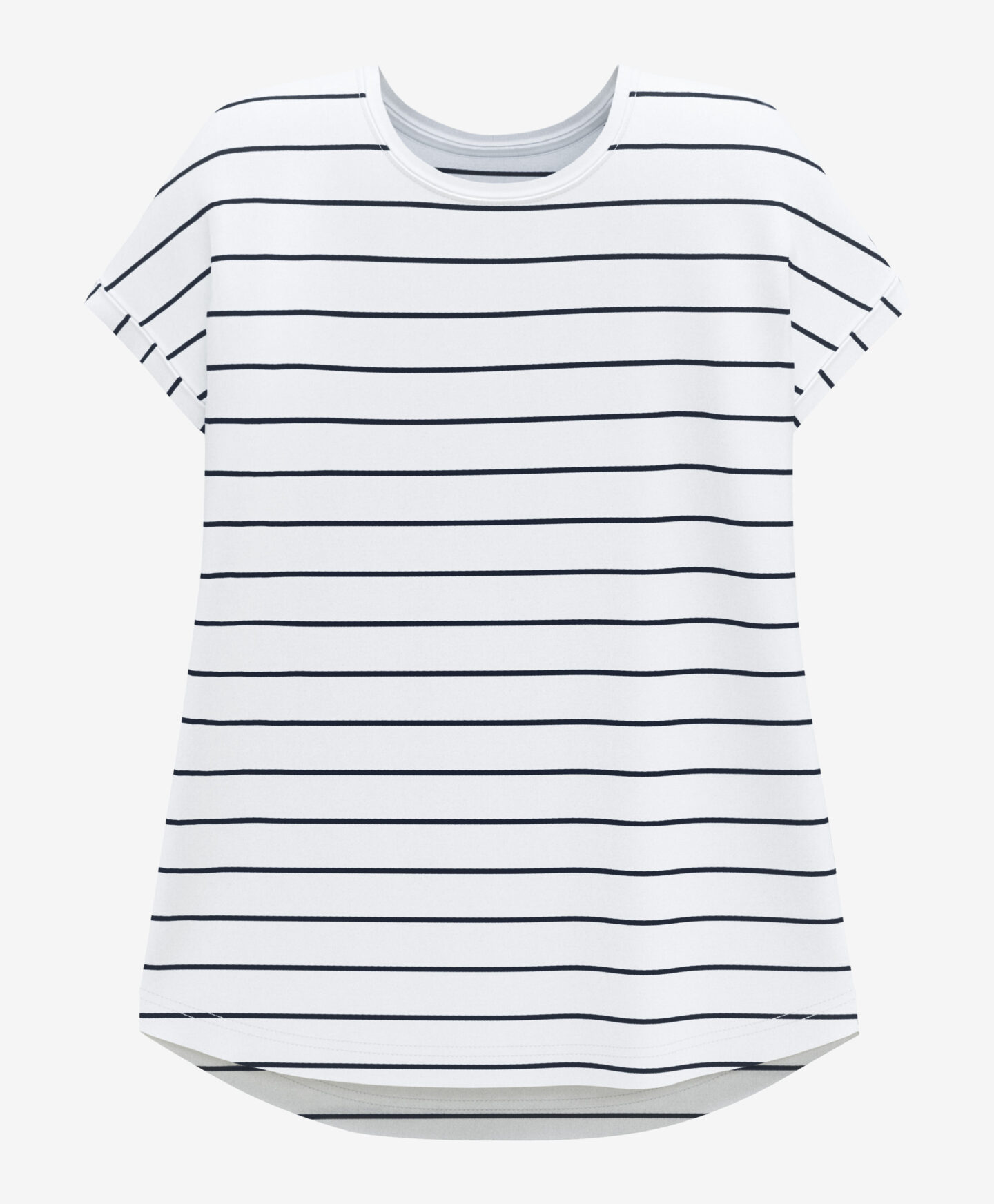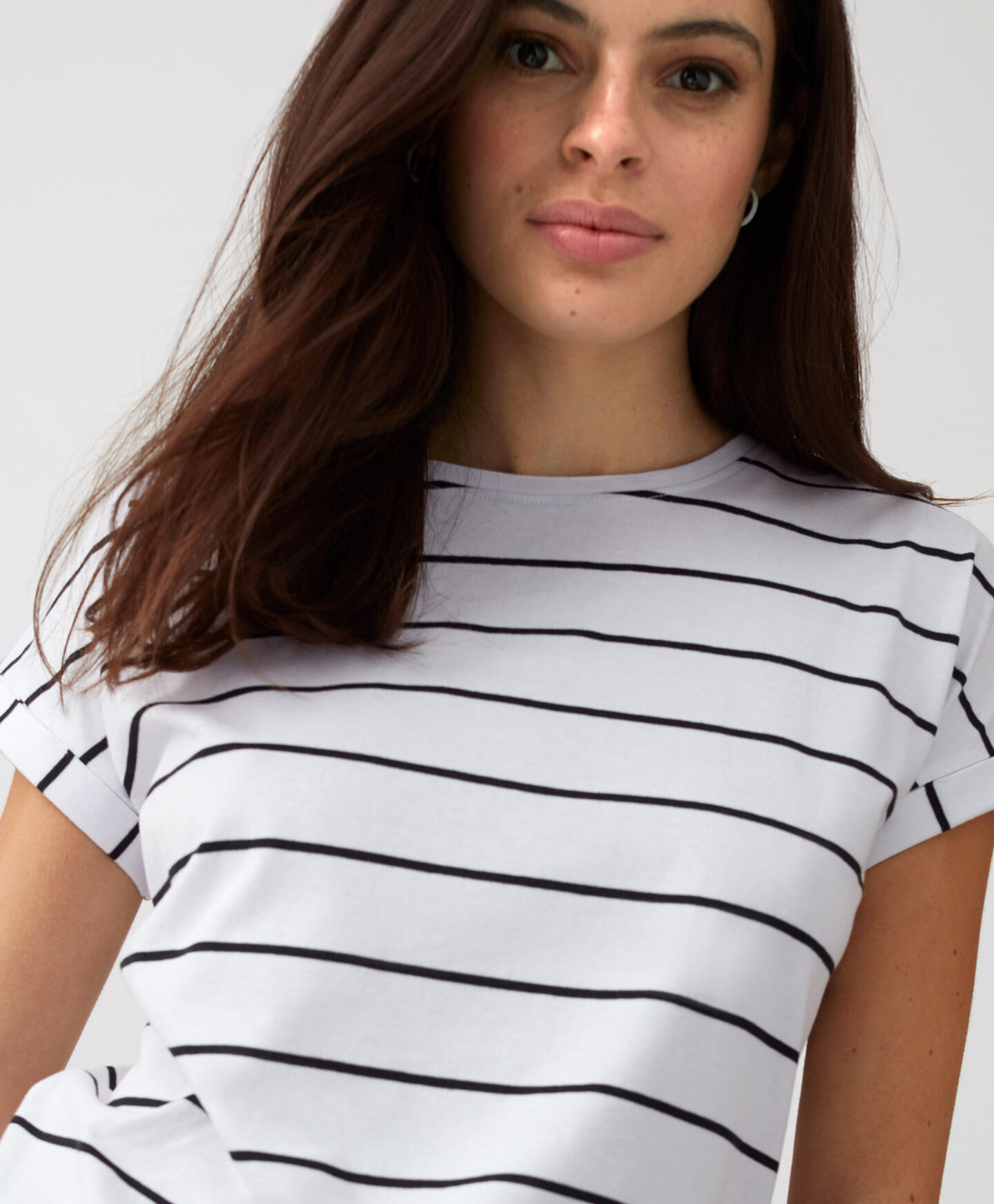 Scopri il fascino intramontabile di questa T-shirt bianca a righe da donna, realizzata in 100% cotone per offrire un comfort insuperabile. Disponibile nelle taglie dalla S alla XXL, questa maglia a maniche corte è la scelta perfetta per affrontare le giornate più calde con stile. Versatile e traspirante, questa T-shirt si abbina facilmente a qualsiasi look, un must-have nel tuo guardaroba.