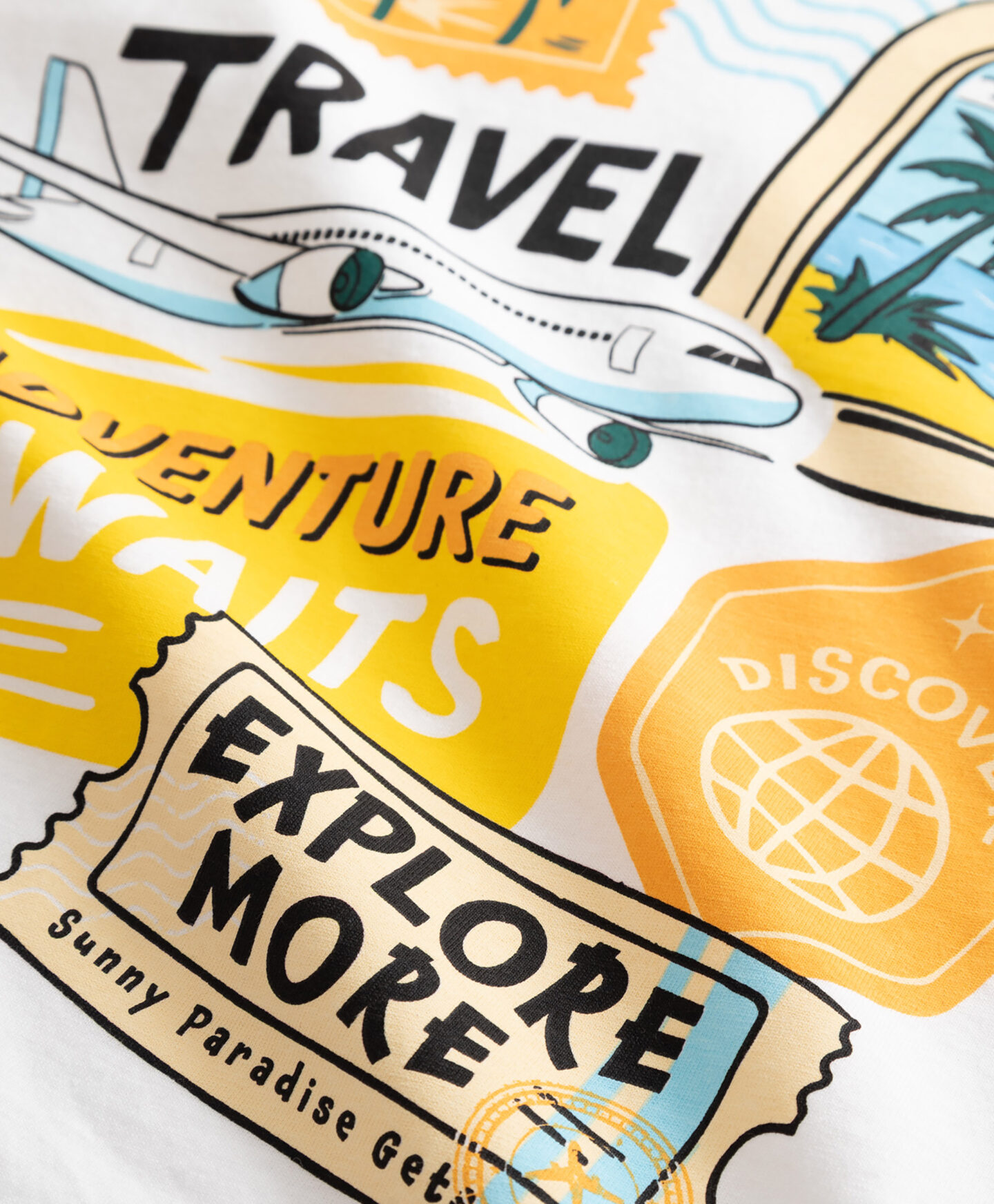 Scopri questa maglietta bianca da bambino in cotone, pensata per i piccoli esploratori! Morbida e traspirante, è perfetta per le giornate più calde o per un look fresco e comodo. Il design ispirato ai viaggi aggiunge subito un tocco di allegria al suo outfit e la rende ideale per le avventure di tutti i giorni o per le gite fuori porta. Leggera e facile da abbinare, è un must-have nel suo armadio!