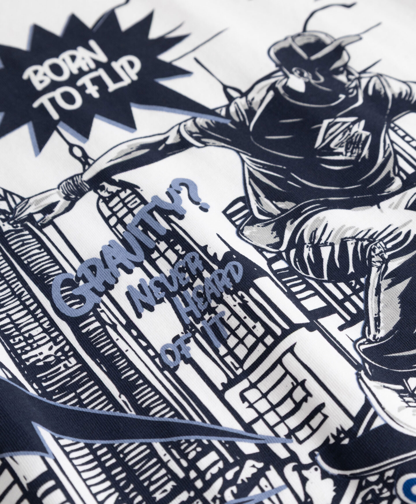 Dai un tocco di freschezza al look con questa T-shirt con una stampa in stile fumetto, realizzata in 100% cotone e perfetta per la scuola o il tempo libero. Le maniche corte e il dettaglio sul davanti aggiungono un tocco moderno e divertente, mentre il tessuto morbido garantisce comfort per tutto il giorno. Questa maglietta è un must-have per un outfit casual e alla moda.