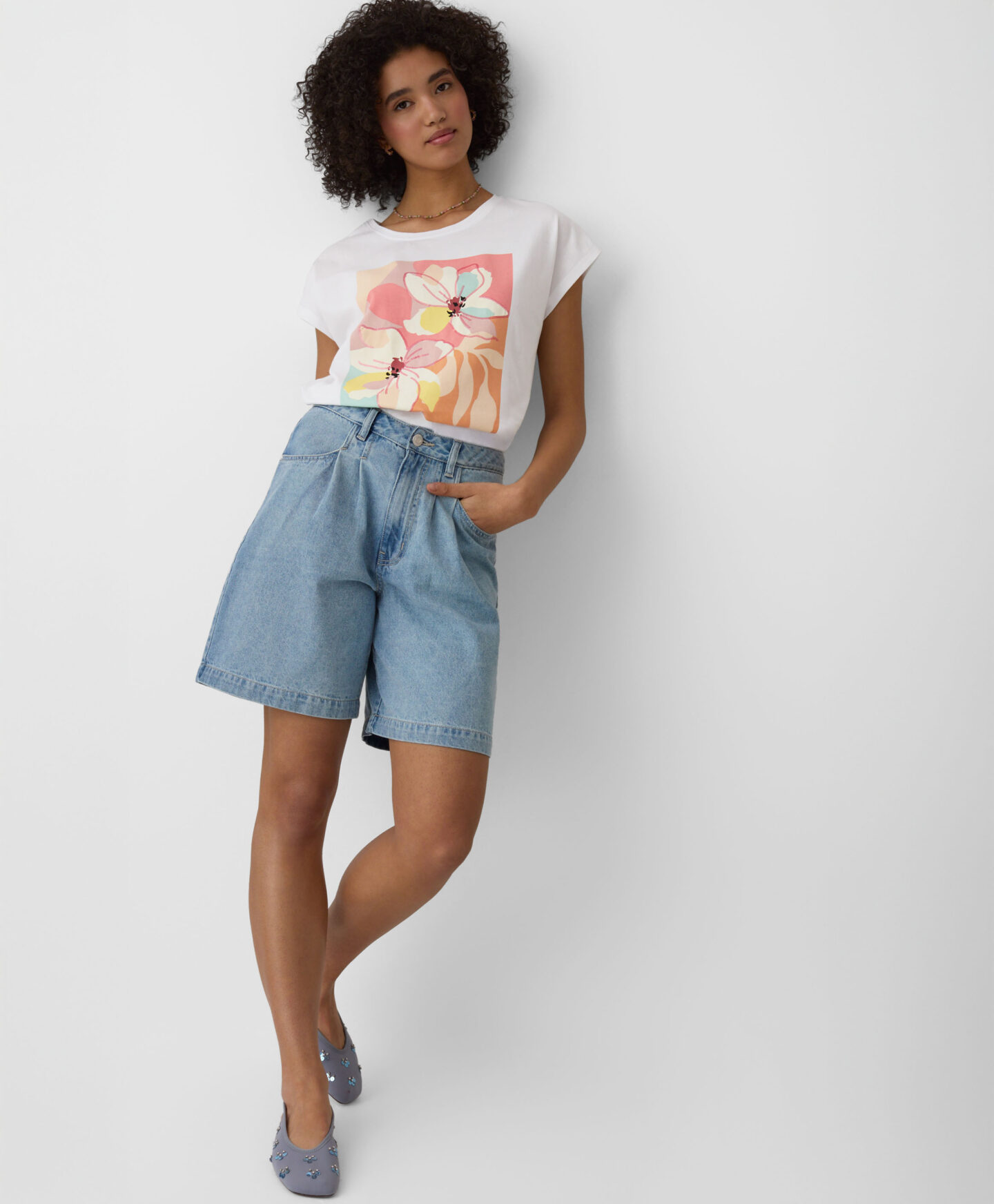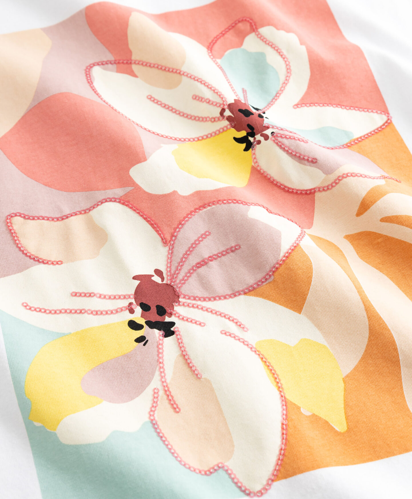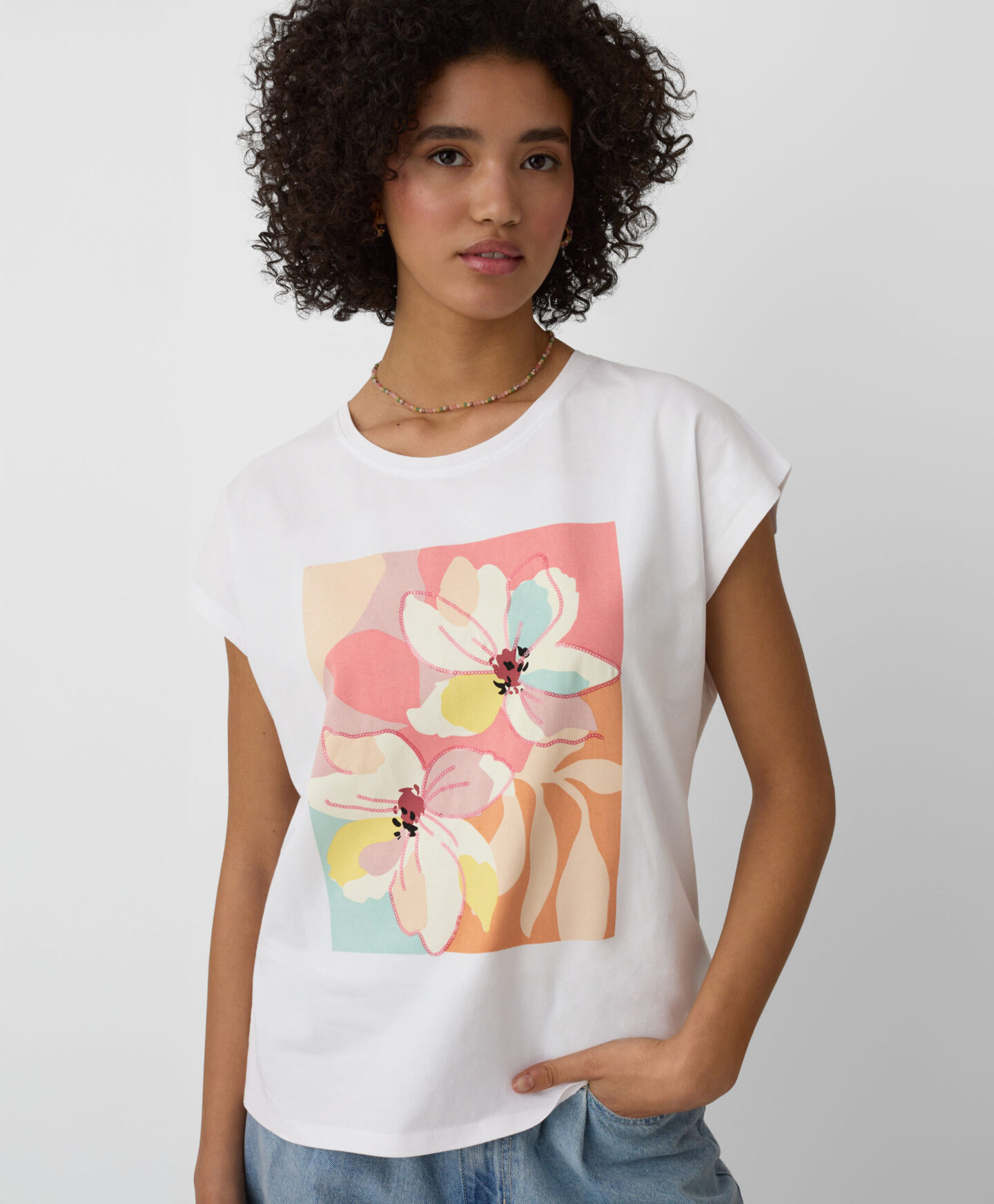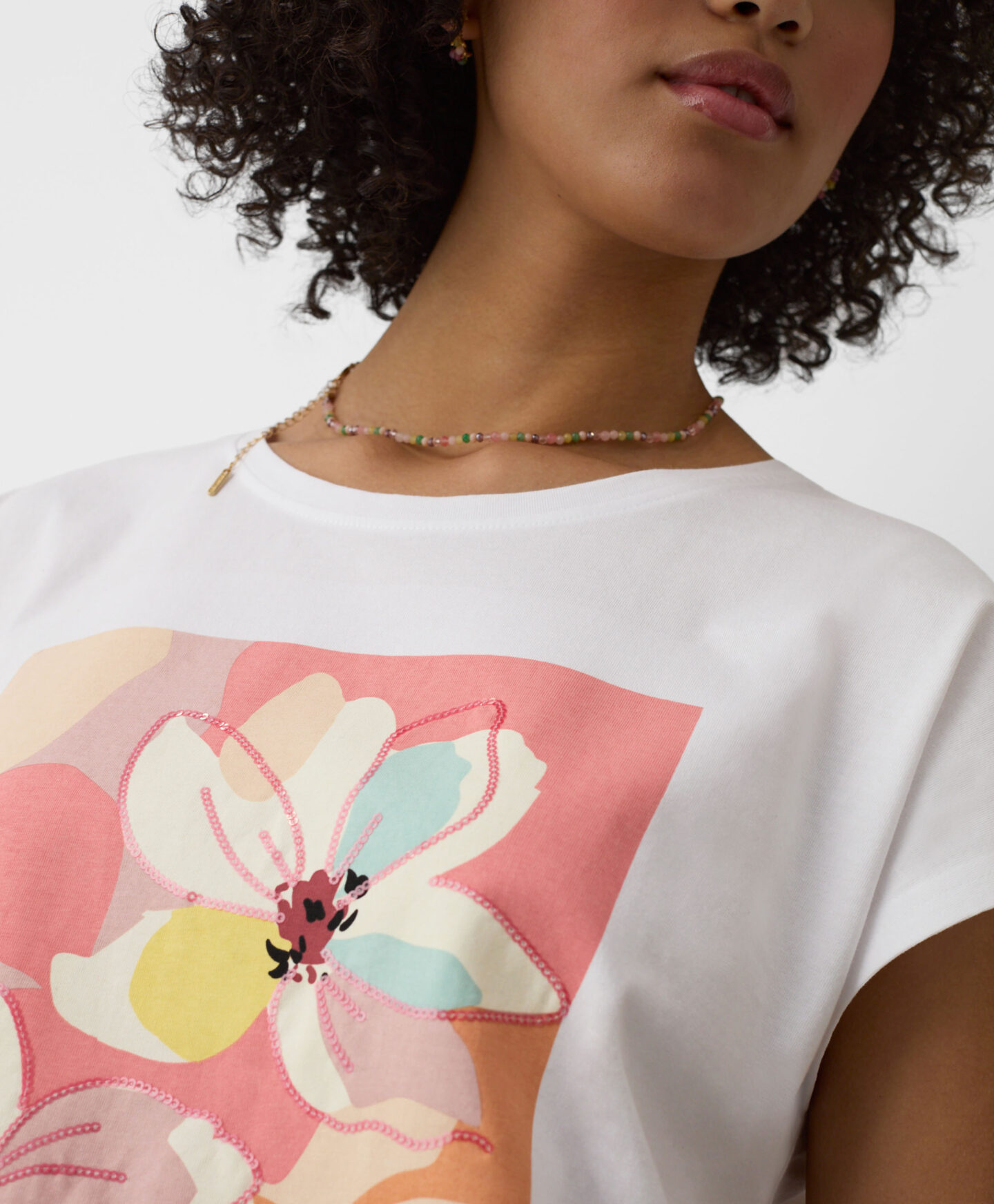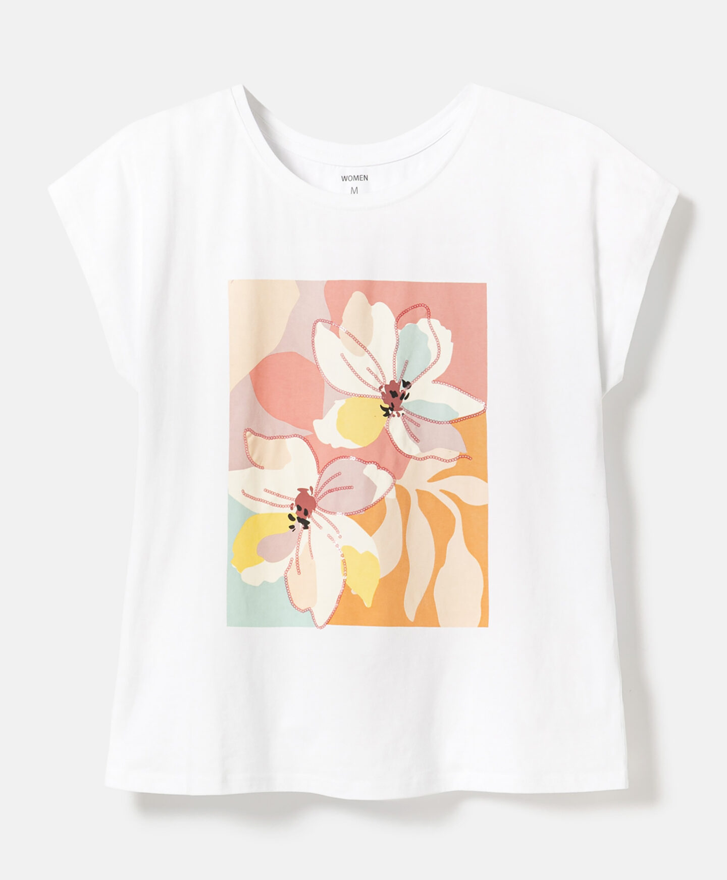 Dai un tocco di magia al tuo stile con questa t-shirt da donna che unisce comfort e originalità. Realizzata in morbido cotone, si adatta perfettamente alla silhouette garantendo una vestibilità impeccabile. Il motivo floreale impreziosito da paillettes sul davanti catturerà l’attenzione e aggiungerà un dettaglio unico ai tuoi outfit. Leggera e traspirante, questa maglietta è perfetta per le giornate estive e si abbina facilmente a jeans, pantaloni eleganti o tute per un look sempre alla moda.