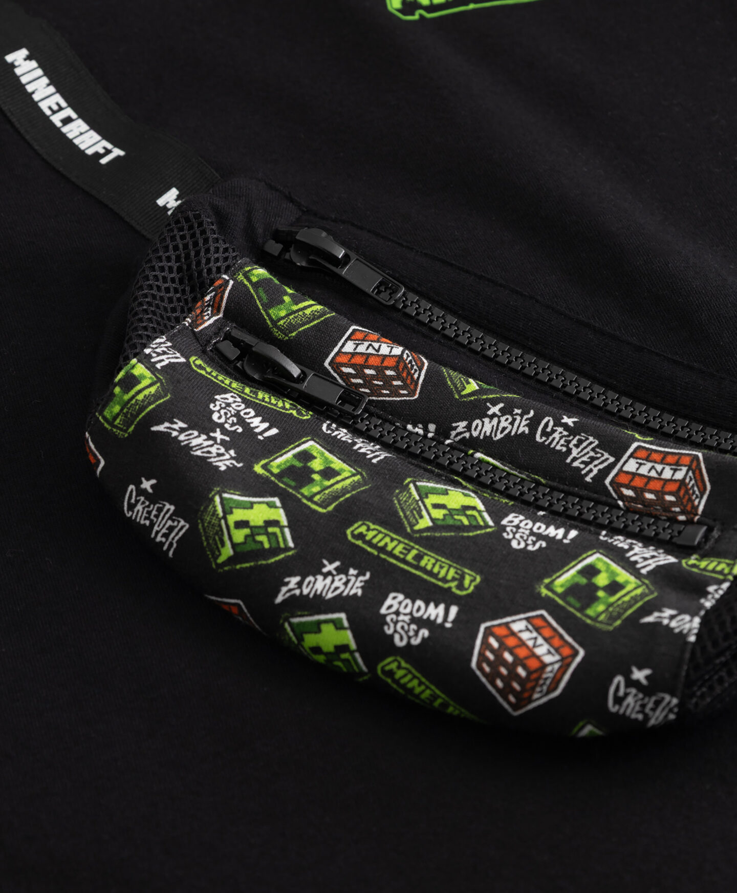 Fai felice il tuo piccolo gamer con questa t-shirt nera di Minecraft da bambino super pratica! Realizzata in morbido cotone, è perfetta per la pelle delicata dei bambini e resiste a mille avventure. Il marsupio integrato è ideale per tenere a portata di mano carte, monete o piccoli giocattoli. Il design nero con i dettagli verdi del famoso videogioco renderà il look ancora più cool.