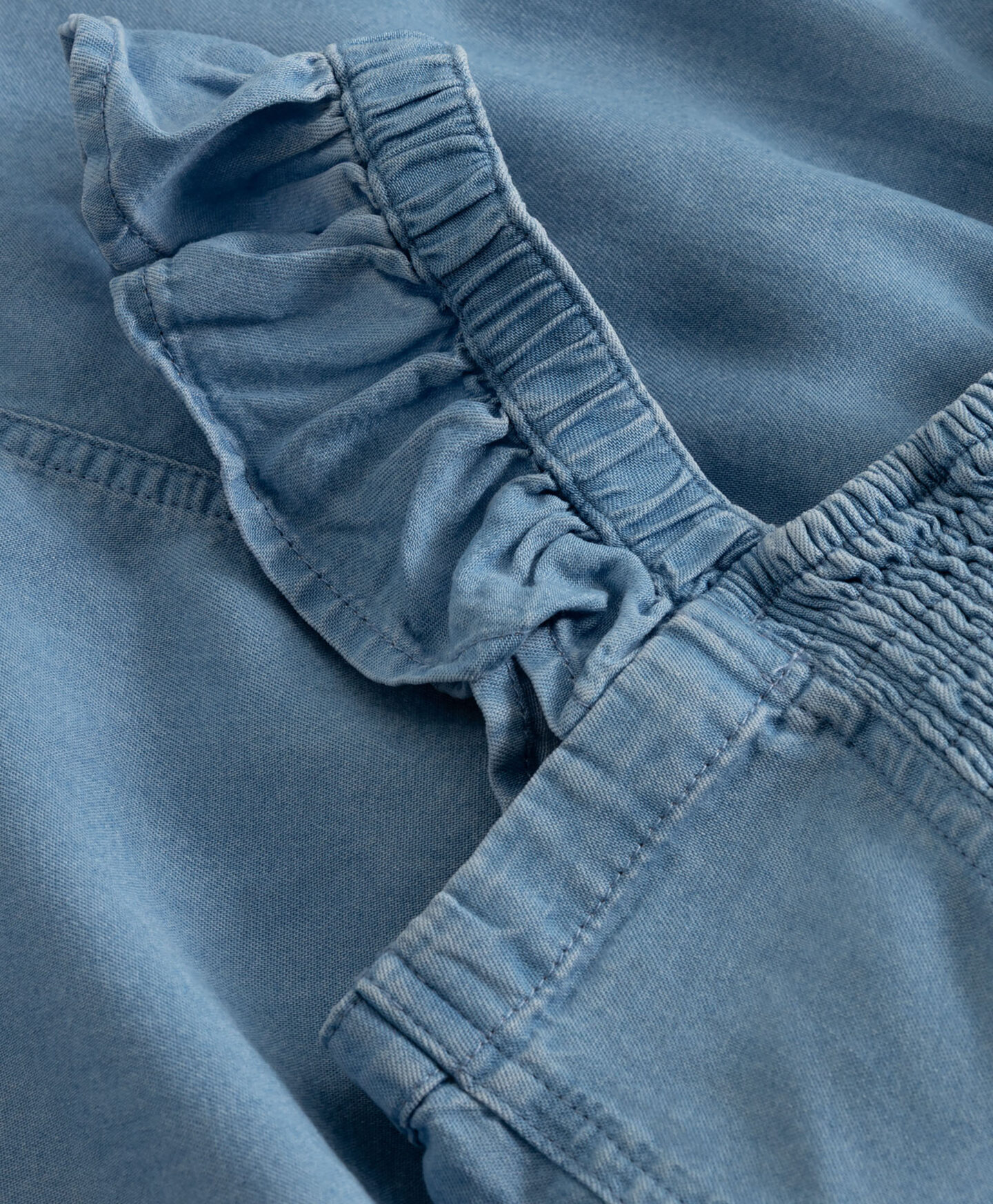Rendi ogni giornata speciale con questa tuta in denim da bambina, un capo versatile e comodo che unisce stile e praticità. Realizzata in 100% lyocell, è morbida, leggera e si adatta perfettamente a ogni movimento. Le spalline impreziosite da volant e le cuciture curate aggiungono un tocco di eleganza, mentre la vita elasticizzata garantisce una vestibilità perfetta. Basta aggiungere un paio di sandali o sneakers per creare un look estivo ideale per passeggiate, gite in famiglia o momenti di gioco all’aria aperta!