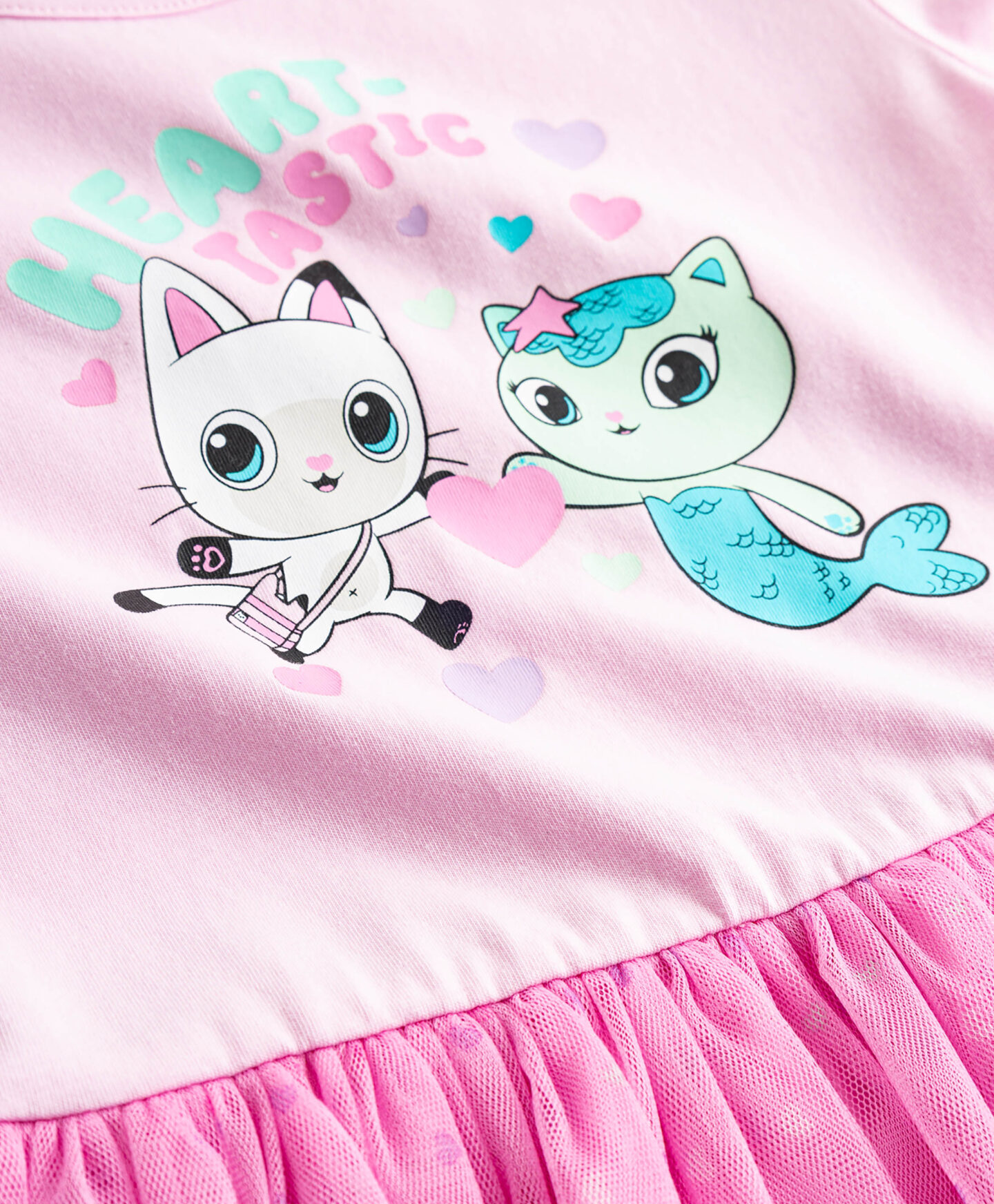 Lascia che la tua piccola entri nel magico mondo della Casa delle bambole di Gabby con questo incantevole vestito rosa! La gonna in tulle dona leggerezza e un tocco da favola, mentre la stampa con i suoi personaggi preferiti sul davanti cattura subito l’attenzione. Perfetto per l’asilo, le feste in famiglia o semplicemente per giocare a fare la principessa, questo vestito è un’idea di styling pronta all’uso che farà brillare gli occhi di ogni bambina.